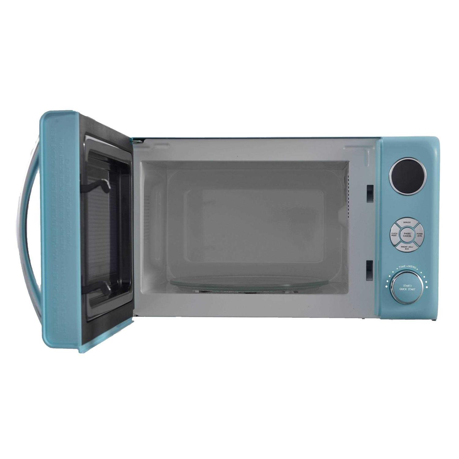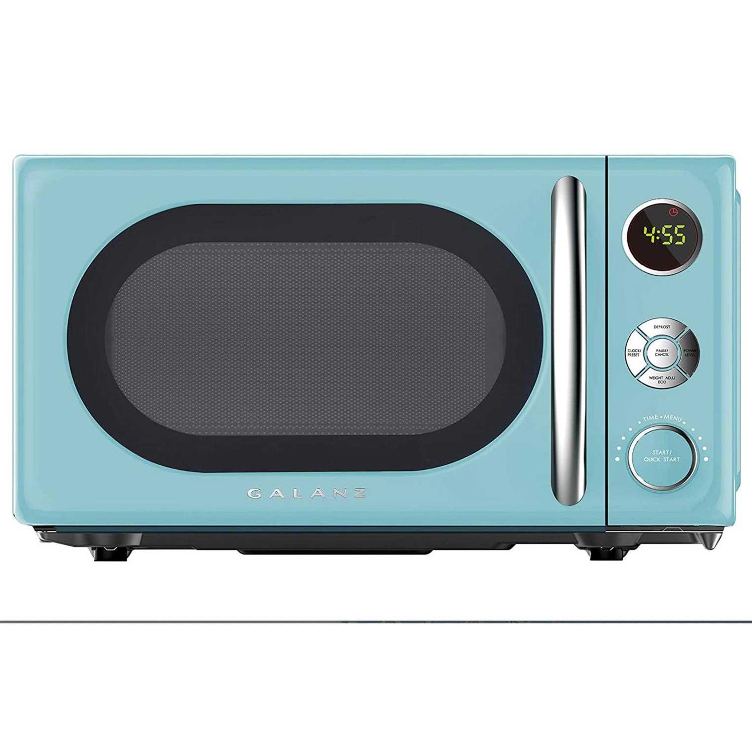 Reheat your food quickly with this blue Galanz Retro countertop microwave. The six autocook functions are suitable for preparing a variety of meals, while the turntable rotates your dishes for even heating. This Galanz Retro countertop microwave boasts a speed cooking feature to ensure dinner gets to the table on time. 700W for basic microwave cooking Warm leftovers, pop popcorn or heat beverages in a flash. Compact 0.7 cu. ft. interior provides enough room for snacks Reheat a small portion of leftovers or cook a treat, such as popcorn. Electronic controls Convenient cooking controls make heating up food fast and simple. Large 9.4′′ turntable keeps food rotating By turning food items as they are prepared, the turntable ensures even, thorough cooking. Defrost settings offer versatility Quickly thaw frozen items, choosing from options that range from speed, weight or time. Bebop blue casing Offers an attractive complement to your existing kitchen décor. A variety of cooking programs to fit your needs Defrost, reheat, beverage, popcorn, pizza, quick start, potato, auto cook, speed defrost, weight defrost, express cook, frozen dinner, and more.