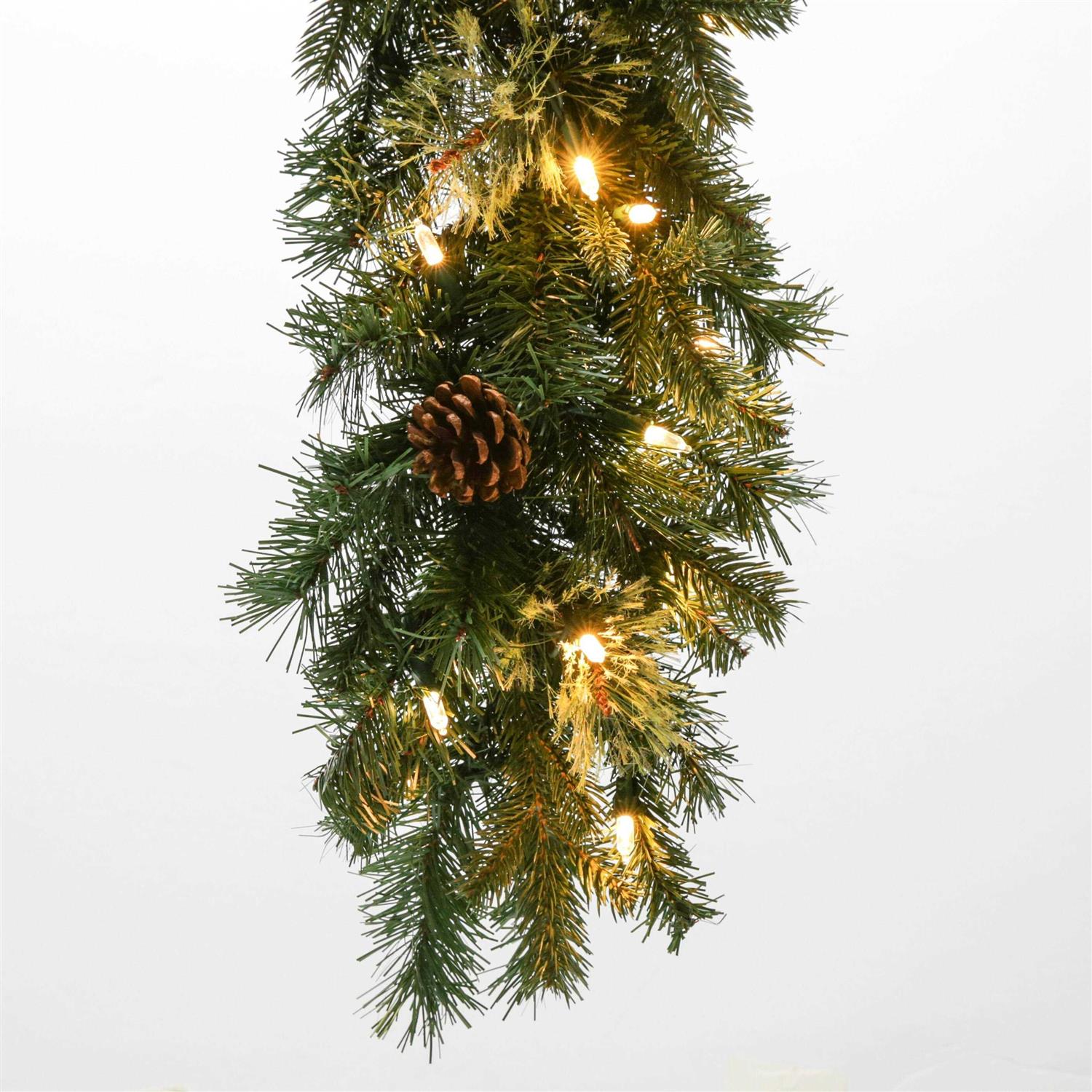 GE 9-foot lighted artificial branch garland pre-lit with 100 Color Choice LED 7-mm color changing lights. Use the control box to choose multicolor lights, warm white lights, or light show settings. 12-Inch diameter, 24-inch lead wire, and 324 mixed needle branch tips accented with pine cones. For indoor use only.