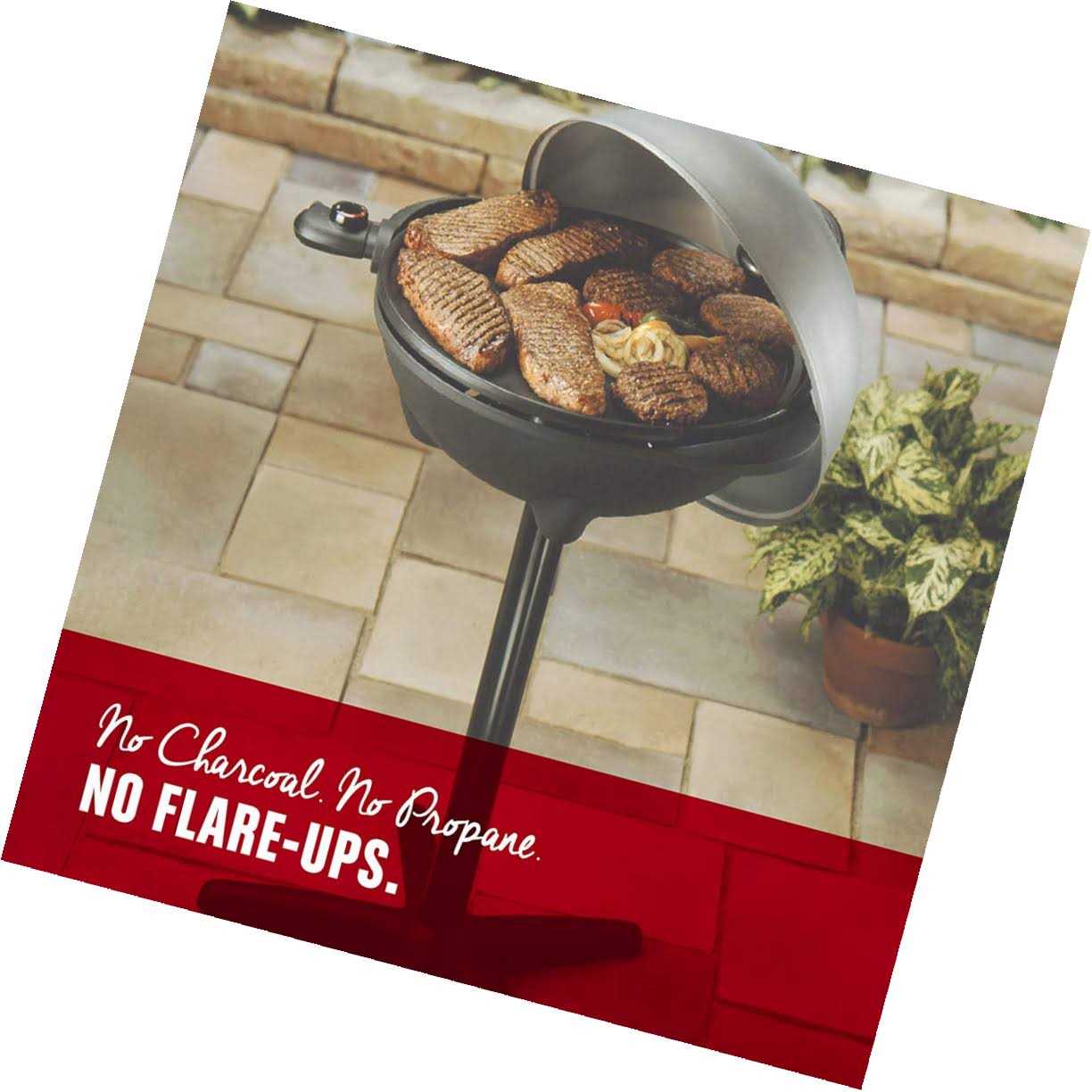 George Foreman · Electric Easily converts from outdoor to indoor use. 240 sq. in. cooking surface. 1 removable grill plate. Center channel drains fat into large grease tray. Double nonstick coated plates. Dome round lid with adjustable steam vent. Adjustable temperature control. Cool touch handles. 1600W. Stand is included. 20″ x 12″ x 21″. Black.