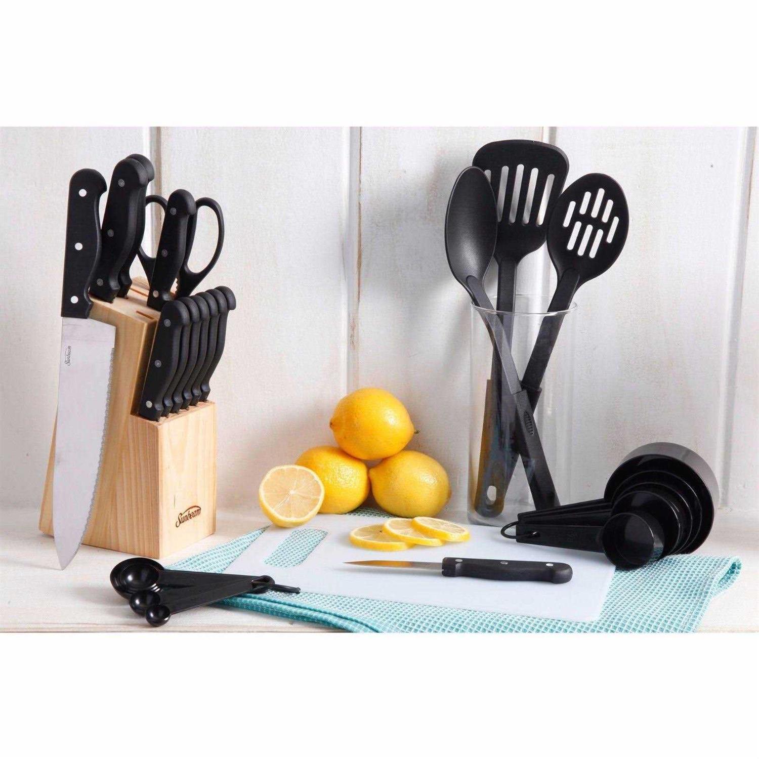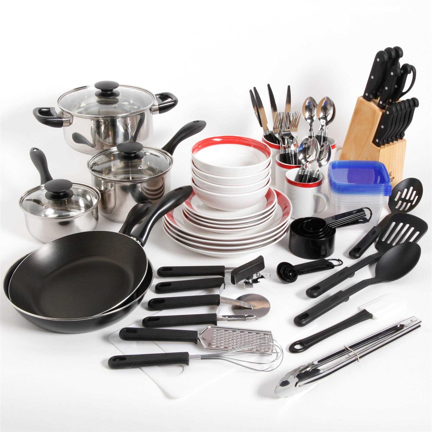 This extensive kit includes all the necessary pieces to make sure you have what you need to prepare cook and serve a meal. It includes a 9.75″ aluminum fry pan for delicious fried eggs and other foods as well as six pieces of stainless-steel pots and pans. This Gibson kitchen set also has 21 tools and gadgets including measuring cups spatulas and slotted spoons. It also includes plenty of storage containers for leftovers.