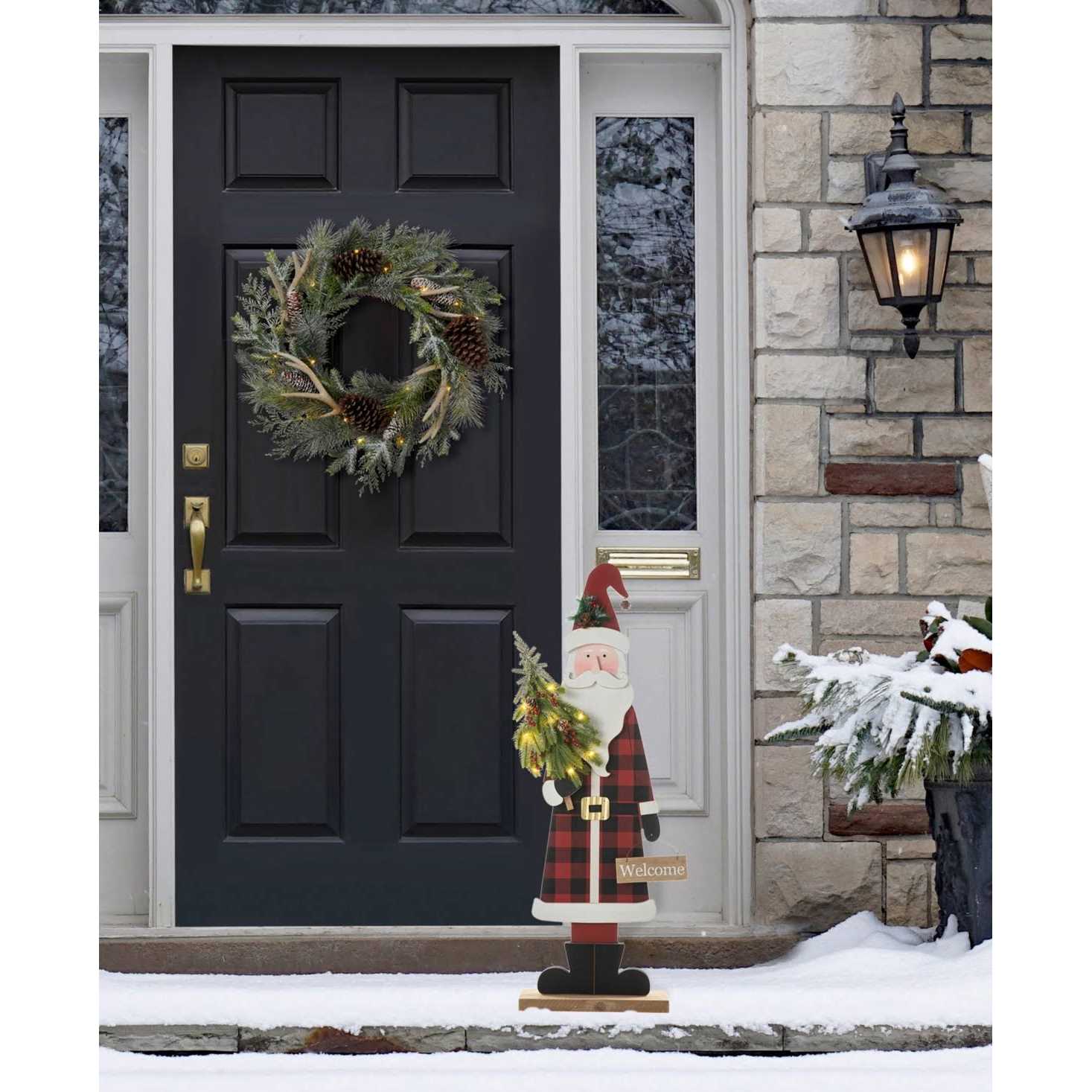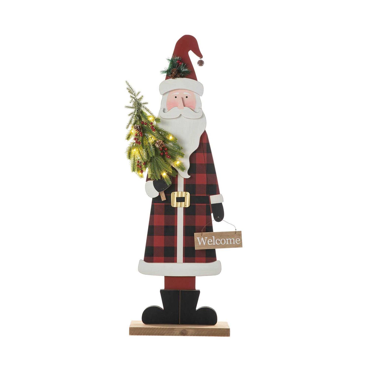 Santa in a red and black plaid coat will greet friends and festival. Christmas tree decorates with berry needles and pine cones in right hand and WELCOME sign in left hand. Red hat decorates with retro bells echoing pine cones. Flashing LED lights are still cheerful and bright at night.
