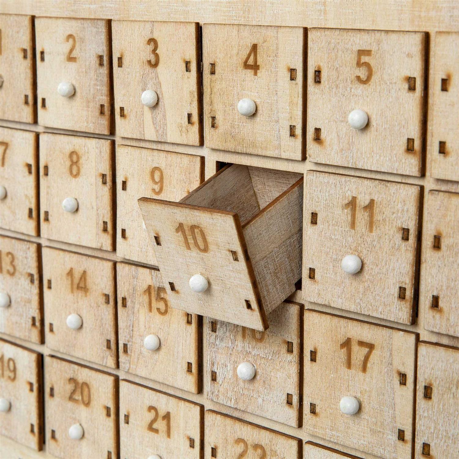 - Made from sturdy plywood shaped display includes 24 drawers for special presents and treats to be stored.