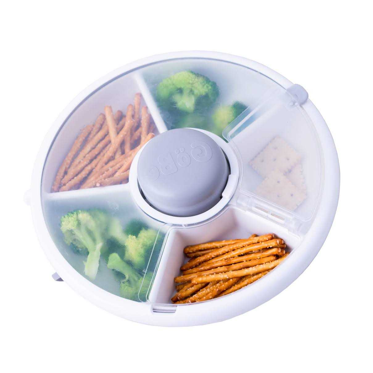 Looking for a way to confidently offer your child a variety of snacks at one time without all the mess? Well say hello to the GoBe Original Snack Spinner! The GoBe Snack Spinner is the only mess-resistant snack container with a push button that allows parents to offer 5 different snacks at once and empowers kids to actively decide what they want to eat. The interactive push button and flip top compartment door will delight children and help them develop fine and gross motor skills as they explore a delicious variety of good eats. Parents will love the convenience that the Snack Spinner provides (without all the mess) and how each compartment, designed to hold ¼ cup of solid food, is perfectly portioned for little ones. Made from durable polypropylene, the Snack Spinner is BPA, PVC, phthalate free and is top rack dishwasher safe-making it a breeze to clean for busy parents! Drop tested 10 times to confirm durability, the GoBe Snack Spinner is the perfect companion to keep kiddos happy, fed, and engaged during all of life’s amazing adventures. Measuring 6.5 inches in diameter, the Snack Spinner’s portable size is an amazing add to the car, diaper bag, daycare bag, or even just around the house, to make sure that snacks are always at the ready. Perfectly designed for little hands, toddlers will love selecting what they want to eat (and when) and parents will appreciate all of the convenience the GoBe Snack Spinner has to offer.