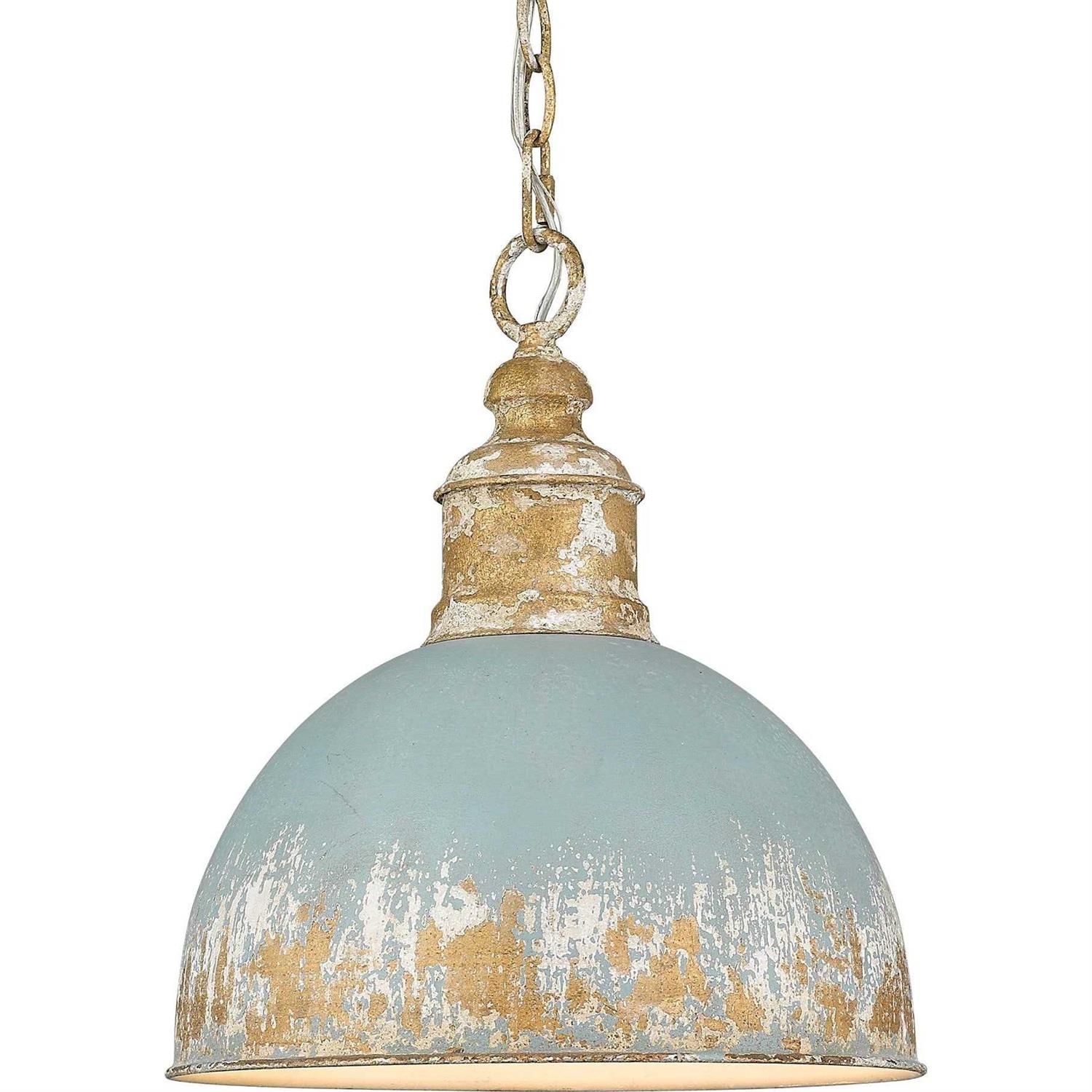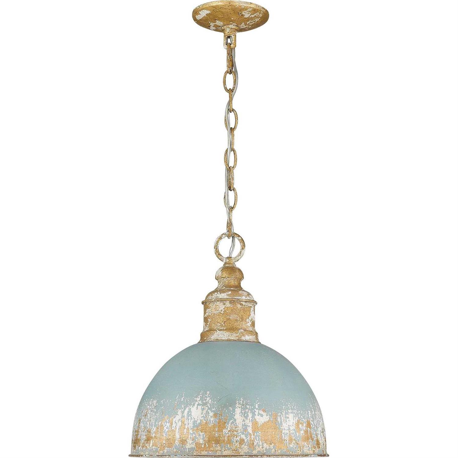 This 0809-M-VG-TEAL Golden Alison Collection Pendant Lights by Golden Lighting features a Rustic style with a perfect Dome shape. The Golden Alison Collection provides an ample amount of extraordinary Lighting in your special space. This 0809-M-VG-TEAL uses an input voltage of 120V and measures 13.875 inches in Height. Golden Lighting Pendant Lights make an excellent solution for kitchen island task lighting, bedroom lighting and Home office lighting. Like a stunning piece of regal artwork, Alison is poised and beautiful. The distressed qualities of the series create an authentic feel. A weathered gold and ivory finish speaks of refinement and age, both of which enhance the design’s dignified splendor. With coordinating shade options, the fixtures work well in rustic and eclectic spaces.