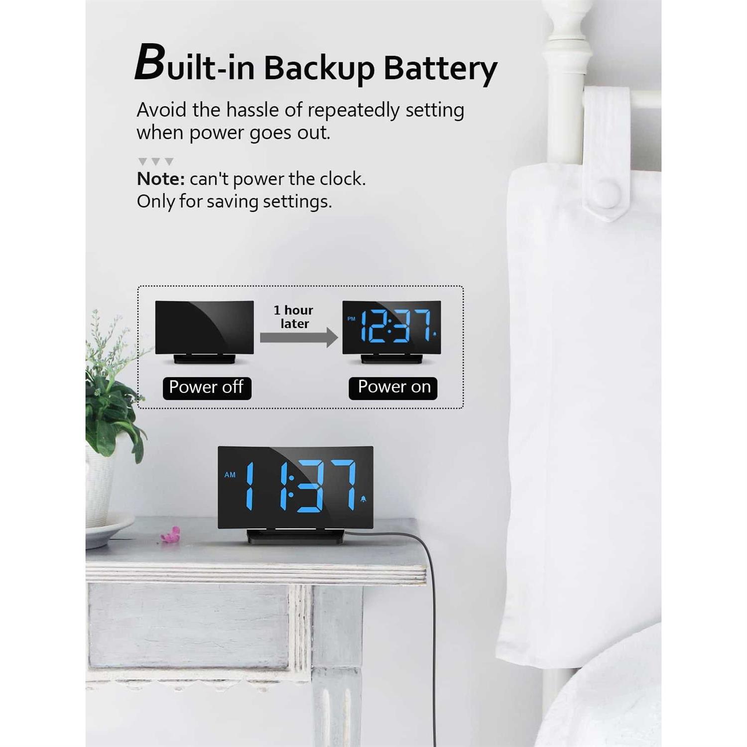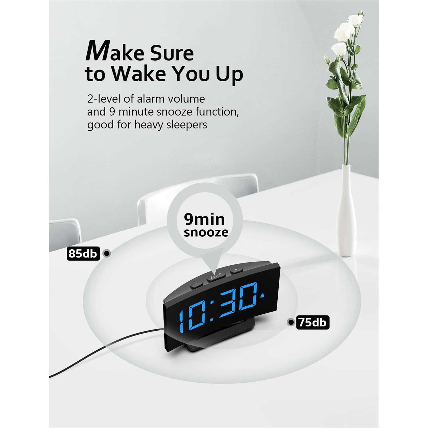 Product Description Digital Alarm Clock For Bedrooms, Digital Clock With Modern Curved Design, Conspicuous Blue Led Numbers, 6 Levels Brightness, 2 Volume, 3 Alarm Tones, Snooze, Power-Off Memory, 12/24H, Bedside Clock & — If You Wear Glasses, You May Want A Digital Clock With A Large Display. If YouuFFFDRe Sensitive To Light, You May Look For A Bedside Alarm Clock With A Full Range Of Dimming Options. This Unique Alarm Clock Has It All And Meets All Your Expectations For Display. The Display Is Big And Bright Enough To See The Time At Any Time Of The Day. 6-Level Brightness Allows You To Adjust The Display From Very Bright To Barely Visible. | 3 2 — Different People Have Different Needs On Alarming Sound And Volume, Control Of Sound And Volume Really Matters. Our Digital Alarm Clock For Bedroom Has 2 Levels Of Alarm Volume Adjustment That Can Be Set From 75.