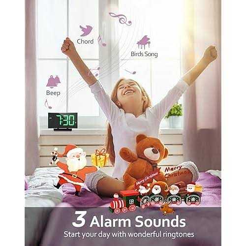 LARGE & CLEAR LED DISPLAY WITH 5 DIMMER +OFF — If you wear glasses, you may want a digital clock with a large display. If you’re light-sensitive, you may look for a bedside clock with a full range of dimming options. This unique alarm clock has it all and meets all your expectations for display. 5 Levels brightness+off allows you to adjust the display from bright to invisible. 3 ALARM TONES AND 2 ALARM VOLUMES – Different people have different needs regarding alarm sound and volume, so controlling the sound and volume is really important. Our digital alarm clock for the bedroom has 2 levels of alarm volume adjustment that can be set from 75-85dB. You don’t need to worry that the alarm sound is too loud and scares you, or too low to wake you from deep sleep. There are 3 fixed ringing music sounds (Birdsongs, Beep, and Chording) that you can choose from. 9 MINUTES‘ SNOOZE TIME — Are you uneasy getting up from your bed? The snooze button at the top of the bedside clock has a raised horizontal line for quick positioning, easy and simple to operate without getting your eyes open when sleepy. For a basic alarm clock for home use, this is enough. Please note: **There is a 6:00 alarm by default when you first power it, if you don’t need it, please switch to the mute key** MEMORY FUNCTION AND 12/24 MODE- For this alarm clock for bedroom, you have the choice between standard time or military time to satisfy your reading time habits. The battery feature works for memorizing the settings in the case of the main power outage. During the battery backup, the screen will go blank and the alarm will not sound, but the clock will display the correct time once power is restored. Please note that this clock is only powered by plugging into the USB port. THE UNIQUE CURVED DESIGN MAKES IT AN IDEAL GIFT–This alarm clock is capable of blending into your interior décor. Designed with versatility in mind, the elegant curve of the clock face, combined with eye-catching green LED numbers, can create a striking appearance that captures the rhythm of time itself. The stylish bedside clock would be an excellent choice as a gift for anyone, and it is suitable for any festival.