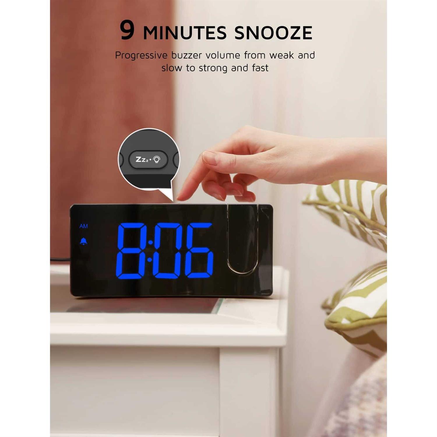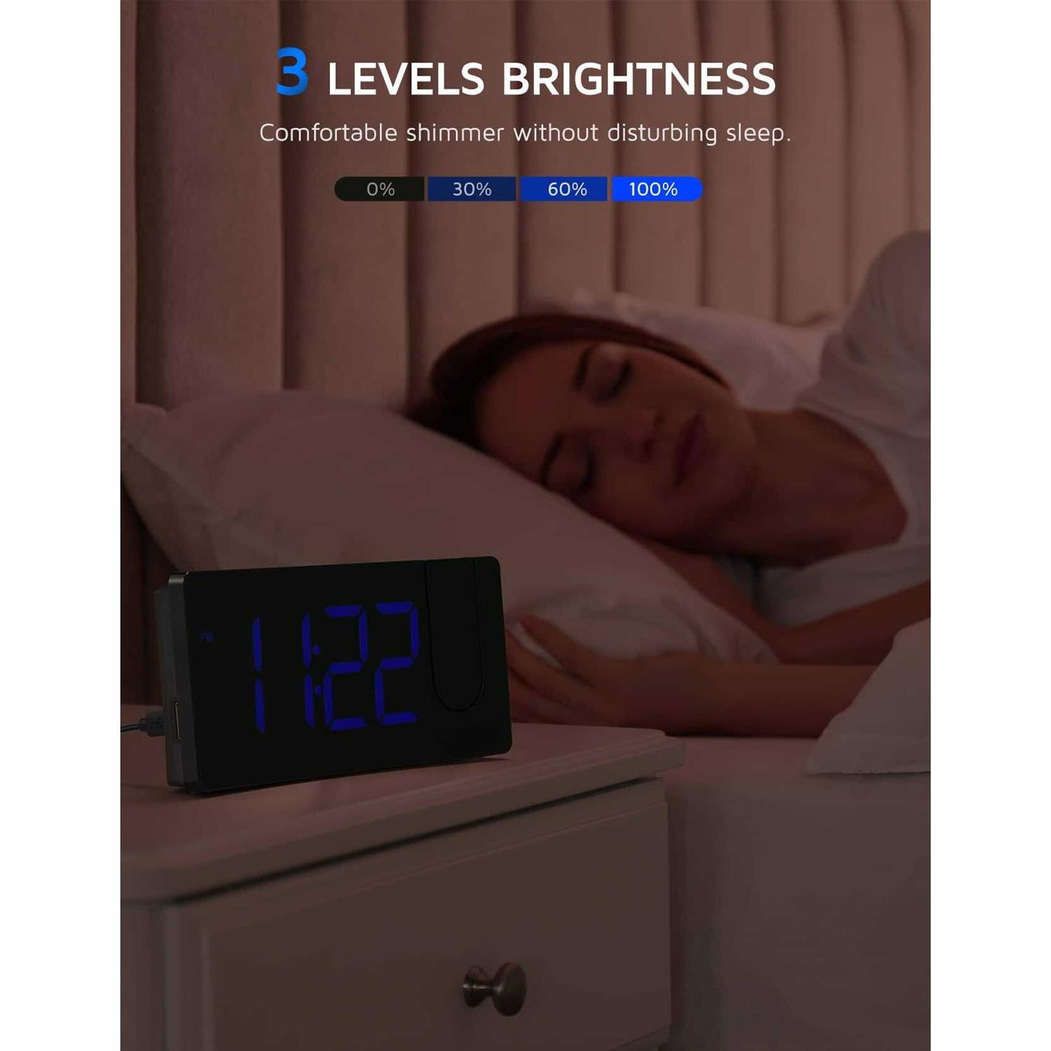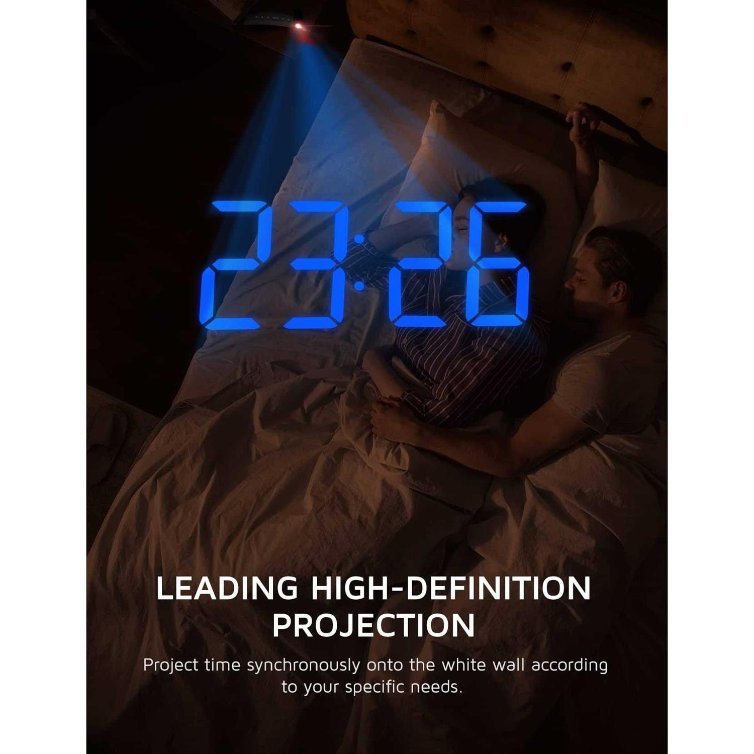 INTEGRATED PROJECTOR WITH A SHARP AND CLEAR IMAGE — The arm of this digital clock swivels 180 degrees for optimum positioning, getting the fine and smooth time figure image on the wall or ceiling at the appropriate distance of 1.64-11.4ft(0.5-3m). The edges of the projected numerals are surprisingly sharp and clear without having to fiddle with a focus adjustment offered on some other projection clocks. LARGE LED DISPLAY & 3 BRIGHTNESS LEVELS — The curved screen with 3.4*1.7inch large digits is easy to read in the dark, even when you are not quite awake or without your glasses. With 3 adjustable levels, you can dial down it to a level that is readable in the daytime but unobtrusive at night. It allows you to separately adjust the brightness of the face display and the projection display. CHARGE USB PORT AND MICRO USB CABLE — This digital alarm clock includes a 5V/1A USB output interface that will allow you to still charge your phone or other mobile devices while the clock occupies an outlet, very good for phone battery health. ALARM WITH PROGRESSIVE BUZZER VOLUME — This particular clock for bedroom comes with a progressive buzzer volume(75dB), the sound will get louder and faster, which is friendly for heavy sleepers who won’t get used to the sudden loud sound. And pressing the big SNOOZE button at the top, you can get extra precious 9 minutes of sleep till the next loop of this alarm. BIG BUTTONS & EASY TO USE — This digital clock has large control buttons which are conveniently lined up along the top of the case and are clearly marked with easily understood icons. Therefore, it is easier to reach and use without changing all the other settings. Friendly to operate for kids, seniors or the elder. BUILT-IN BACKUP BATTERY — The package contains an AC adapter(AC100-240V,50/60Hz) to power the digital clock. When the power is off unexpectedly, the button cell battery(CR2032) built into the bedside clock can automatically save time & alarm settings (the time is not displayed and the alarm won’t go off), no need to reset it again when the power is on. STYLISH AND UNIQUE CURVED DESIGN — A curved screen mimics your eyes’ curvature for a more comfortable viewing experience and also can improve your health, too. Research Gate reports that a Harvard Medical School study found curved screens are better at reducing eyestrain and blurred vision and improving focus compared to regular screens. A GIFT FOR ANY OCCASION — This digital clock is a great choice to show your care, and an unusual idea to surprise. A perfect gift for everyone, no matter for old or young, men or women, boy or girl. Also suitable for any festival like birthdays, Christmas, New Year’s Day, Thanksgiving Day, Valentine’s Day, Father’s Day, Mother’s Day, etc. Imagine that when you waking up in the night and want to know what time it is, raise yourself on one elbow and twist to read your old bedside clock. Even, you had to fumble around for your glasses to read the small numerals, causing you to fully wake up and have difficulty falling back to sleep. A projection clock would be a great solution to this problem.