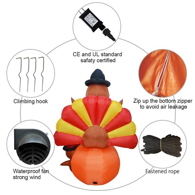 Inflatable Yard Decorations by GOOSH. Details:Thanksgiving Inflatable Turkey with Pumpkin Decoration – The inflatable turkey is designed with cute outlook reaches a height of 6ft. Installed in the courtyard to enjoy Thanksgiving with your family and spreading happiness to your neighborhoods. Eye Catching Light – The Thanksgiving Decoration turkey has eye-catching super bright LED lights that make it look perfect every Holiday night. The bright lights in the body give it a great night effect, perfect for anyone’s decorative holiday graveyard. Install with Confidence – No need to worry that Thanksgiving inflatables outdoor decoration cute turkey will fly away by the wind. Thanksgiving blow up outdoor decoration come with the stakes and ropes to secure it on the ground. It is easy to set up this inflatables decoration by extended cord and fastened ropes. Plug in blower, then everything pops up in a minute! Easy and Safe to Installed – The Turkey Inflatable Decoration with a 10ft power…