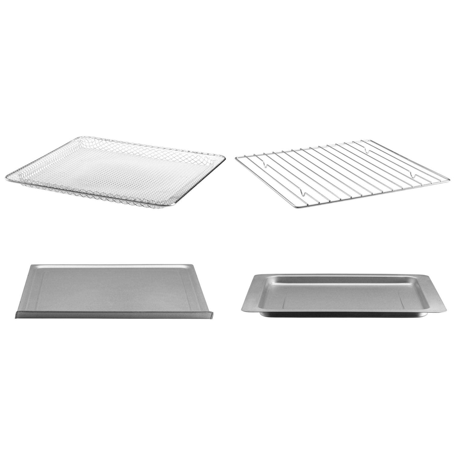 - Dishwasher safe: Oven rack, baking pan, fry basket, and crumb tray