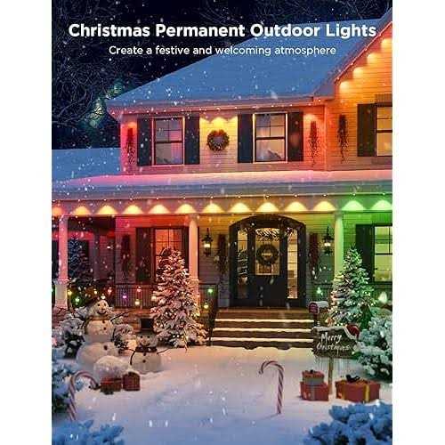 Festive RGBIC Lighting: Choose from 75 scene modes and 16 million colors to light up house with the govee outdoor lights. Light up your garden and yard for Christmas parties. It can only connect up to 9 light segments and 2 extension cables. Eye-Catching Lighting Effects: The lens design reveals a unique triangular lighting effect. The wall washing depth is greater than 16 inches, while the brightness of each light is 26 lumens. Install the lights 2-4 inches away from the wall surface. Outdoor Durability: Added anti-UV material, the outdoor lights are IP67 waterproof with IP65 Rated Control Box and Adapter. Year-round Christmas decorations can use for up to 50,000 hours and work in bad weather from -4°F to 140°F (-20°C-60°C). Simple Installation: Must use provided VHB glue and clips to install each Christmas light in 8 seconds. Splice through waterproof joints every 16.4ft and install them on eaves. Please note that the govee Christmas lights cannot be cut. Smart App & Voice Control: Use Govee Home App to control colors of each govee light independently and set timer function to light up Christmas parties. Pair the Christmas gift lights with Alexa and Google Assistant for smart voice control. Govee Permanent Outdoor Lights, Smart RGBIC Customizable LED Lights with 75 Scene Modes, IP67 Waterproof Year-Round Lighting Work with Govee Home App and Alexa and Google Assistant, 150ft Holiday Lights with 108 Eaves Lights for Celebration, Birthdays, Parties, Game Day, Daily Lighting, Halloween, Christmas, Roof, eaves, New Year, St Patricks Day, Easter, Mothers Day, Fathers Day, 4th of July Decorations