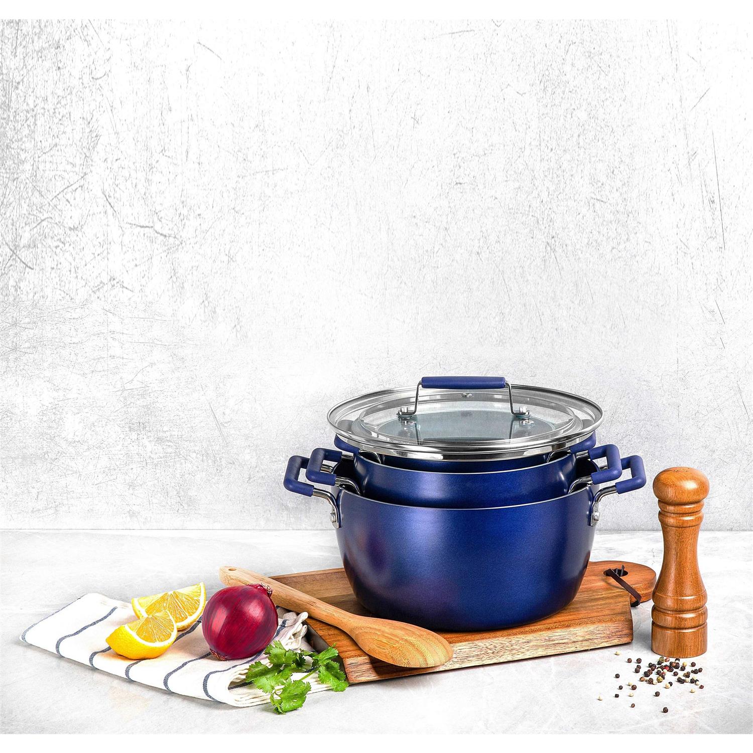 • Set includes: 1.5 qt. saucepan with collapsing handle lid, 3 qt. saucepan with lid, and 5 qt. dutch oven with lid