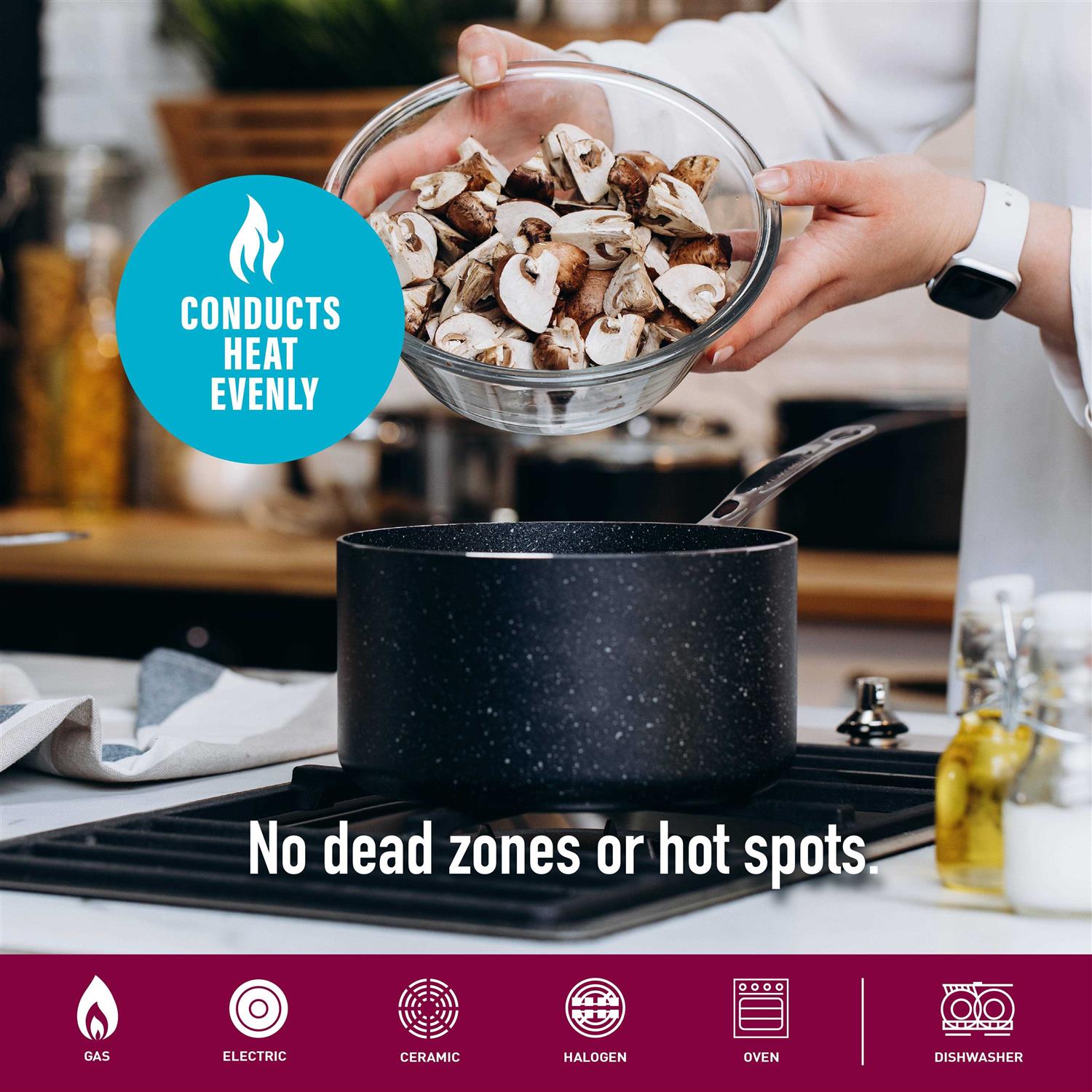 Cook countless meals to perfection with the help of this beautiful cookware set from Granitestone Diamond. The Granitestone non-stick cooking surface is coated 3 times and then reinforced with diamonds to deliver the ultimate food release experience. Coating is derived from minerals and reinforced with diamonds, ensuring this frying pan is free of PFOA, PFOS, lead, and cadmium. Triple food-grade granite layers for maximum durability and to prevent age or heat-induced warping. Stay-cool handles are ergonomically designed for both righties and lefties and lets heat escape to keep the handles cool to the touch. Compatible with gas, electric, glass and induction cooktops and oven safe up to a sizzling 500°F, lids included. Metal utensil safe. Dishwasher safe.