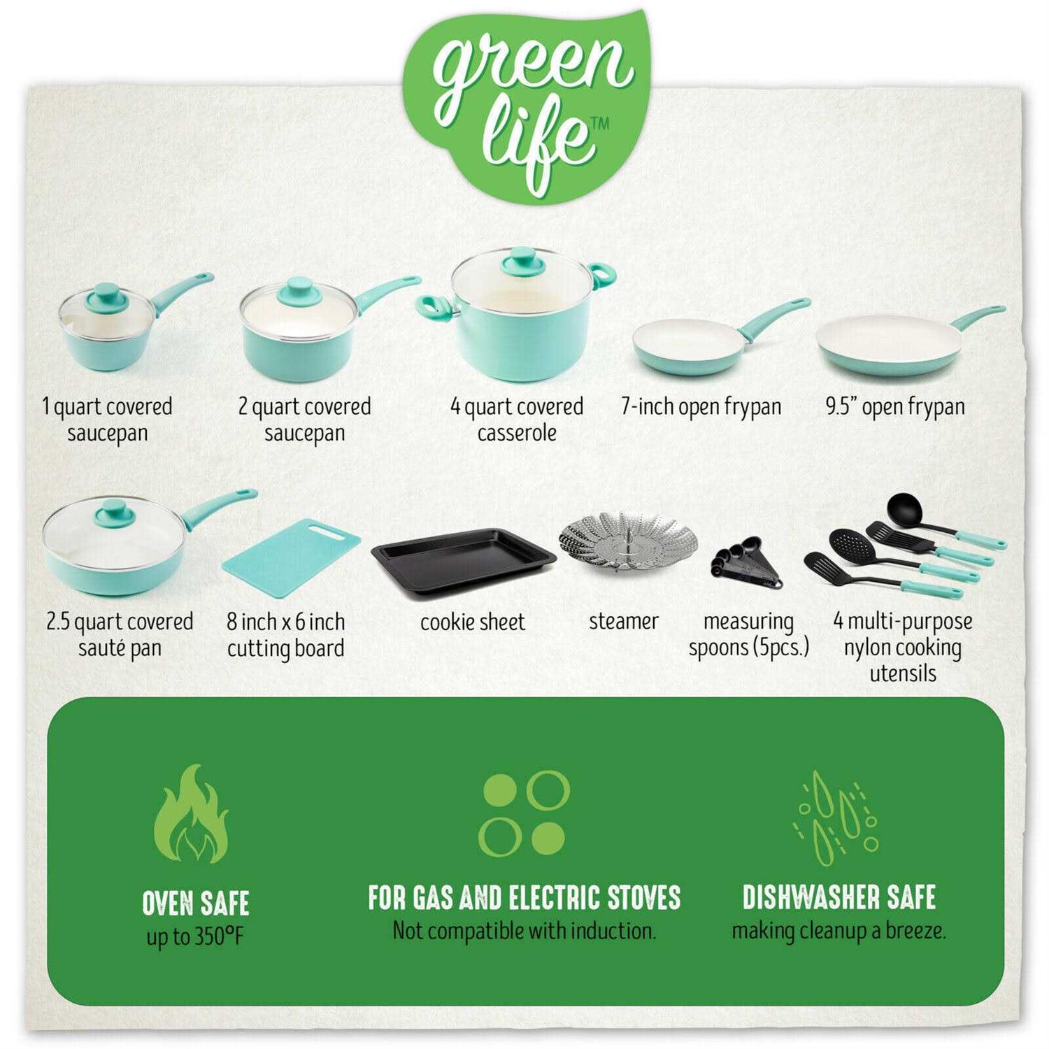 GreenLifes healthy ceramic nonstick is not stuck in the pastthats why our ceramic nonstick starts with sand and creates 60% less CO2 emissions during the curing phase than traditional coatings. Finished in vibrant colors, this set is outfitted with stay-cool handles to keep your cooking comfortable. Please be sure to read the description thoroughly to make sure that this is the item you want before making a purchasing decision. Please be aware that slight variations in color may be due to differences in lighting and computer monitor resolutions. Boxes or APOs. An adult signature will be required. Please be sure to have available help on hand to assist you with moving the item to the desired location in or outside of your home. You can request a refund if you are dissatisfied for any reason with your product. Only factory defects are accepted as a reason for a return. The item and package should be in original and perfect condition.