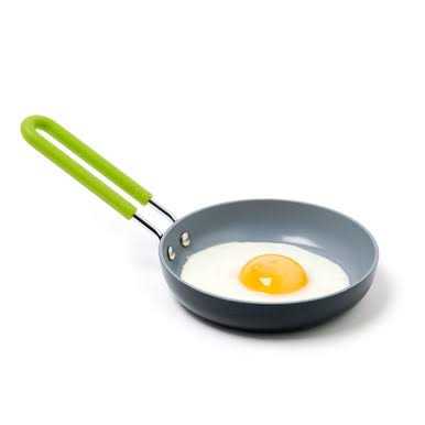 Easily make personal size breakfast fare and cook eggs the way you want them with the GreenPan 5″ Mini Round Egg Pan. Petite design has a thermally efficient aluminum body, stainless steel with cool-touch silicone handle, and a ceramic nonstick interior. GreenPan’s 5″ Mini Round Egg Pan is perfectly proportioned for preparing personalized breakfast and brunch fare. Thermally efficient aluminum body construction delivers rapid, even heating without any hotspots. Grey Thermolon‚ Marathon ceramic nonstick coating on the cooking surface delivers easy food release and quick cleanups. Durable, black-finished aluminum exterior. Compatible with most stove types, except induction. Riveted stainless steel handle with silicone ‘stay-cool’ sleeve for safe, confident handling. Petite single-serve design. PFOA-free. Aluminum and stainless steel. Dishwasher safe. Measures 9″ L x 5″ W x 3″ H. Limited lifetime manufacturer’s warranty. Imported.