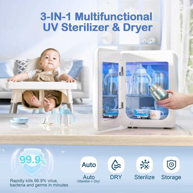 (Pre-Owned) 【Sterilize in Minutes】With mirror inner wall design, 360°sterilizing by reflecting UV light becomes more efficient. PTC drying technology provides safer, faster and more uniform drying performance. Sterilizing bottles or devices in minutes safely and effectively protect your baby’s and family’s health.. 【Easy to use】Auto (sterilize+dry; 25/35/45/55/65 min; default time: 60min); Drying (20/30/40/50/60 min; default time: 40min); Sterilize (10/15/20 mins; default time:15min ); Storage (run every 2 hours for sterilizing). Designed with a smart touchscreen and an easy-to-read timer that lets you sterilize, dry, and store items with a single touch. Run the auto mode to sterilize and dry your daily essentials. Featured with child lock mode can avoid accidental touch.. 【Multi Purpose】This UV Sterilizer and Dryer device is intended for baby products, adult and child’s intimate clothing, jewelry, beauty tools, tableware and mobile phones. Ideal for sterilizing and drying your baby items, toys, and all your personal items.. 【Large Capacity】Capable of accommodating 16 baby bottles. Dimensions : 11 x 12.6 x 15.2 in / Weight : 9.92Ib, 18L Large capacity without occupying space. 24h storage can automatically and continuously keep sterilized items clean. Always be ready to feed your baby.. 【Intimate design】Child-safe design, built-in safety features and auto-off timers protect against harmful UV exposure. It will auto shuts-off when the door is opened during use. Please pay attention to the product’s plug before purchasing.
