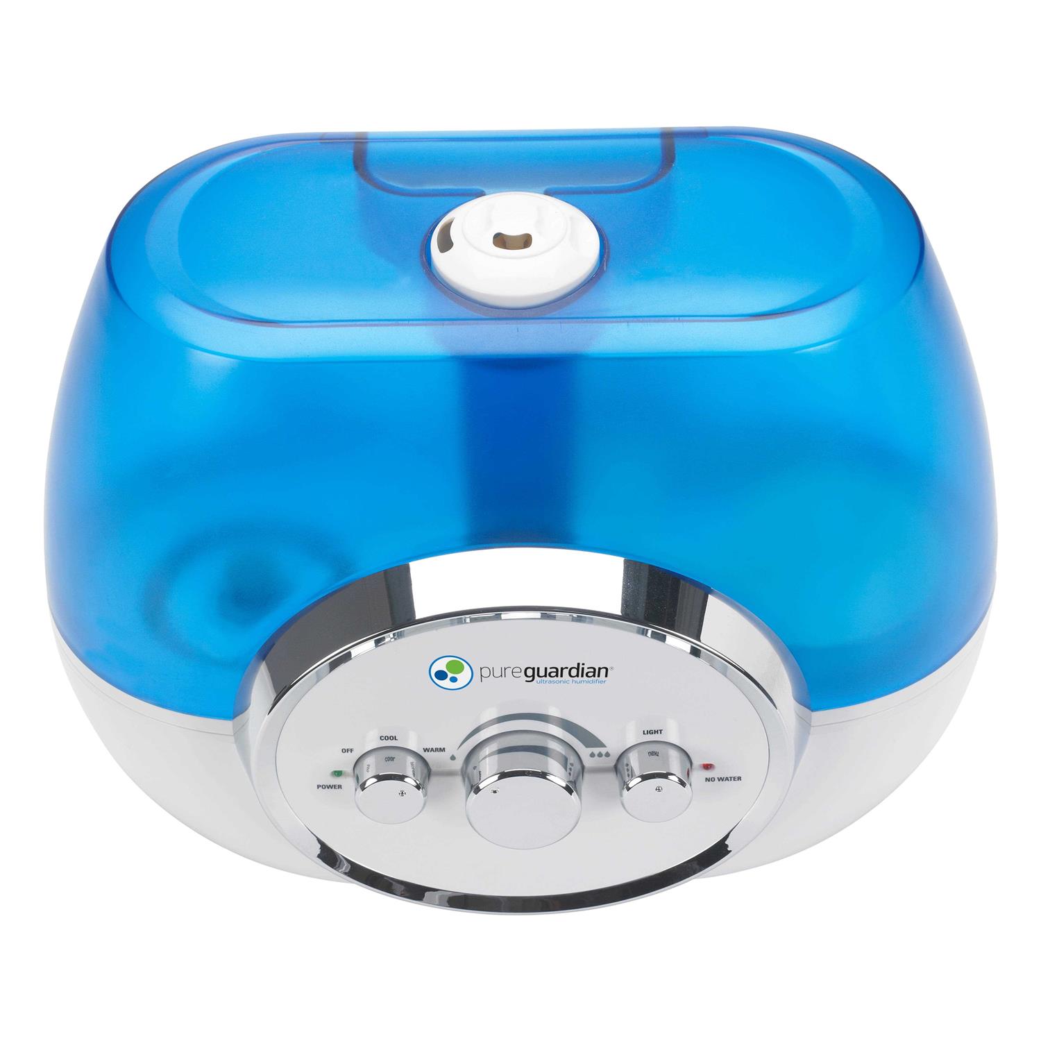 The 100-hour Ultrasonic Warm and Cool Mist Humidifier guards against problems caused by dry air in the home. It features an easy to fill large 1.5-gallon tank, ideal for use in medium sized rooms. Cleanliness matters! Unlike other humidifiers that grow slimy mold on the water tank surface, Silver Clean Protection is embedded in the tank to fight the growth of mold and mildew on the surface of the water tank. Thanks to ultrasonic technology, it disperses a fine mist into the air, and is ultra-quiet, making it ideal to have on while you sleep. The humidifier is equipped with the option for warm or cool mist, a night-light and variable mist control. A low water indicator light lets you know when it’s time to refill the water tank. PureGuardian humidifiers create a better home environment for those suffering from colds, allergies and dry skin. It is important to only use GENUINE Guardian Technologies replacement parts to maintain product performance.