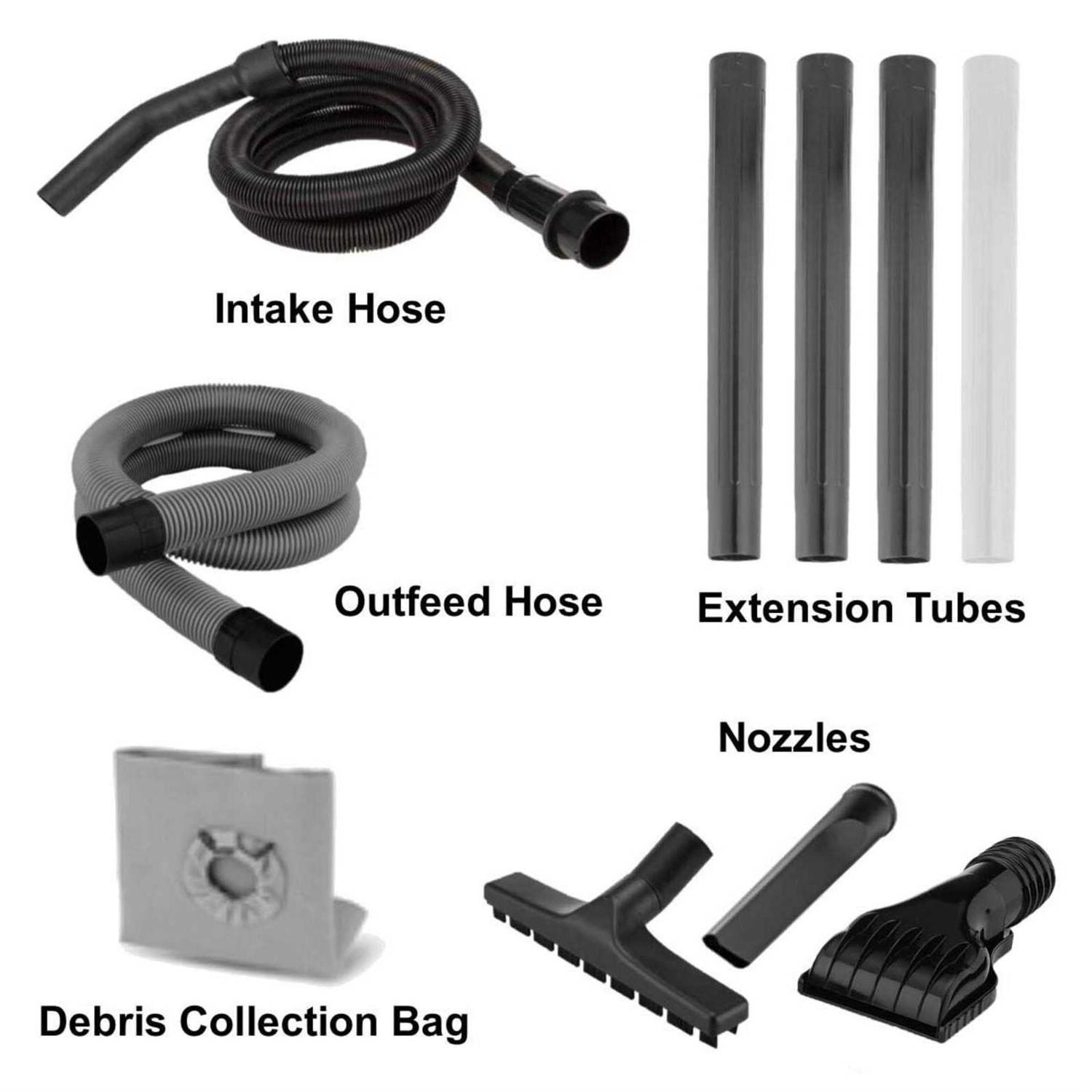 - Includes 13 foot intake hose, 4 extension tubes, 3 vacuum nozzles, 6.5 foot outfeed hose, debris collection bag that attaches to outfeed hose
