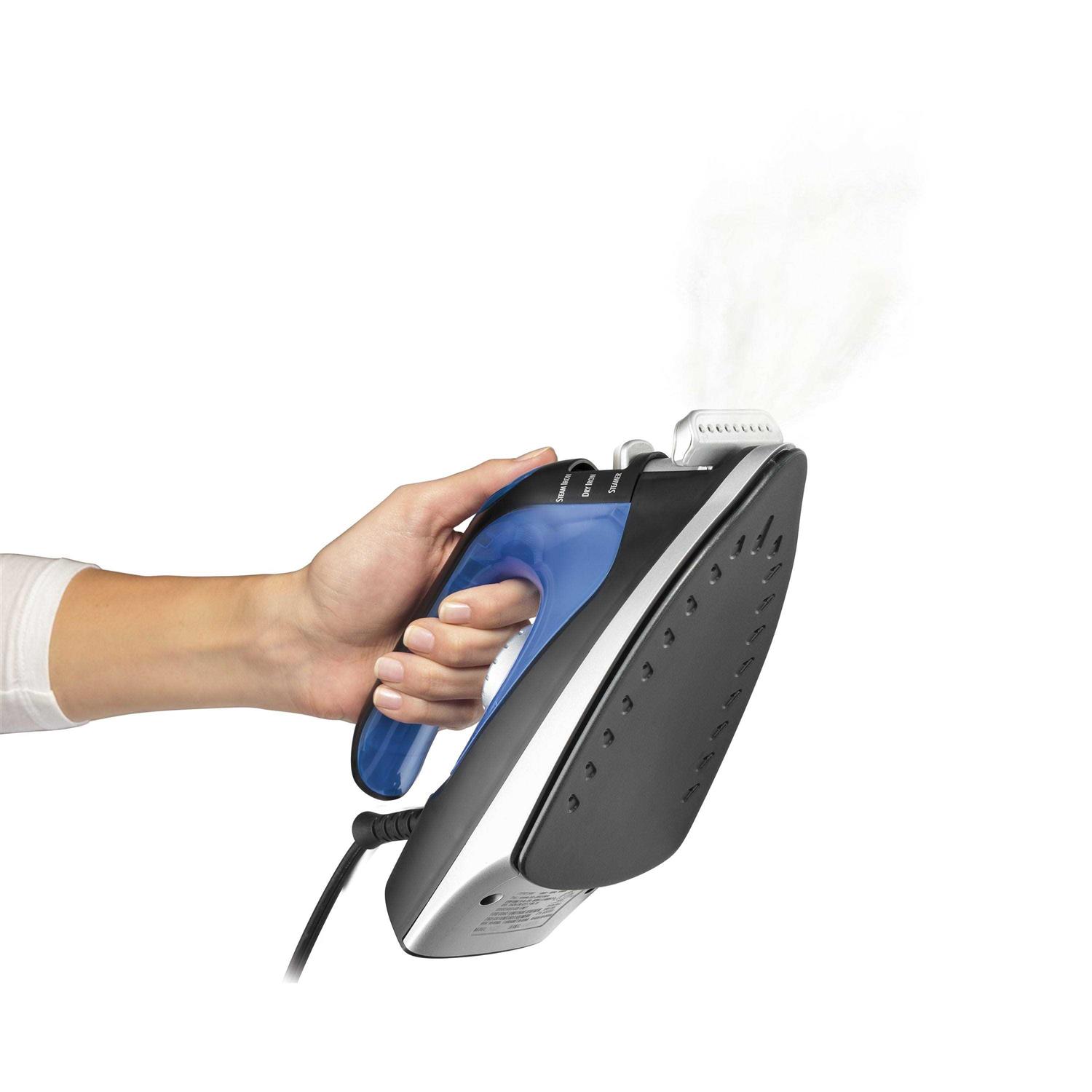 The Hamilton Beach 2 in 1 iron or steamer lets you freshen clothes and remove wrinkles 2 ways. Iron the traditional way or steam clothes right on the hanger. The steamer is perfect for freshening clothes and loosening wrinkles when you’re in a hurry. With a lightweight and compact design, you’ll always iron and steam in comfort. The compact size makes the iron easy to store without taking up a lot of space. This iron or steamer has a durable, non-stick soleplate that smoothly glides across all fabrics to remove wrinkles without sticking whether you’re ironing a delicate dress for a party or everyday shirts. The easy-slide lever is simple to adjust so you can seamlessly move from ironing to steaming. Just slide to select your choice – steam iron, dry iron or steamer. For targeted steaming, the wide nozzle directs continuous steam onto clothes to loosen wrinkles and freshen up your clothes, no ironing board needed. The iron or steamer is powered by 1200 Watts and has 5 temperature settings for ironing a variety of fabrics and clothing from delicate silk blouses to linen slacks. The iron is easy to fill from the top, has an easy-view water window and a long 8′ cord.
