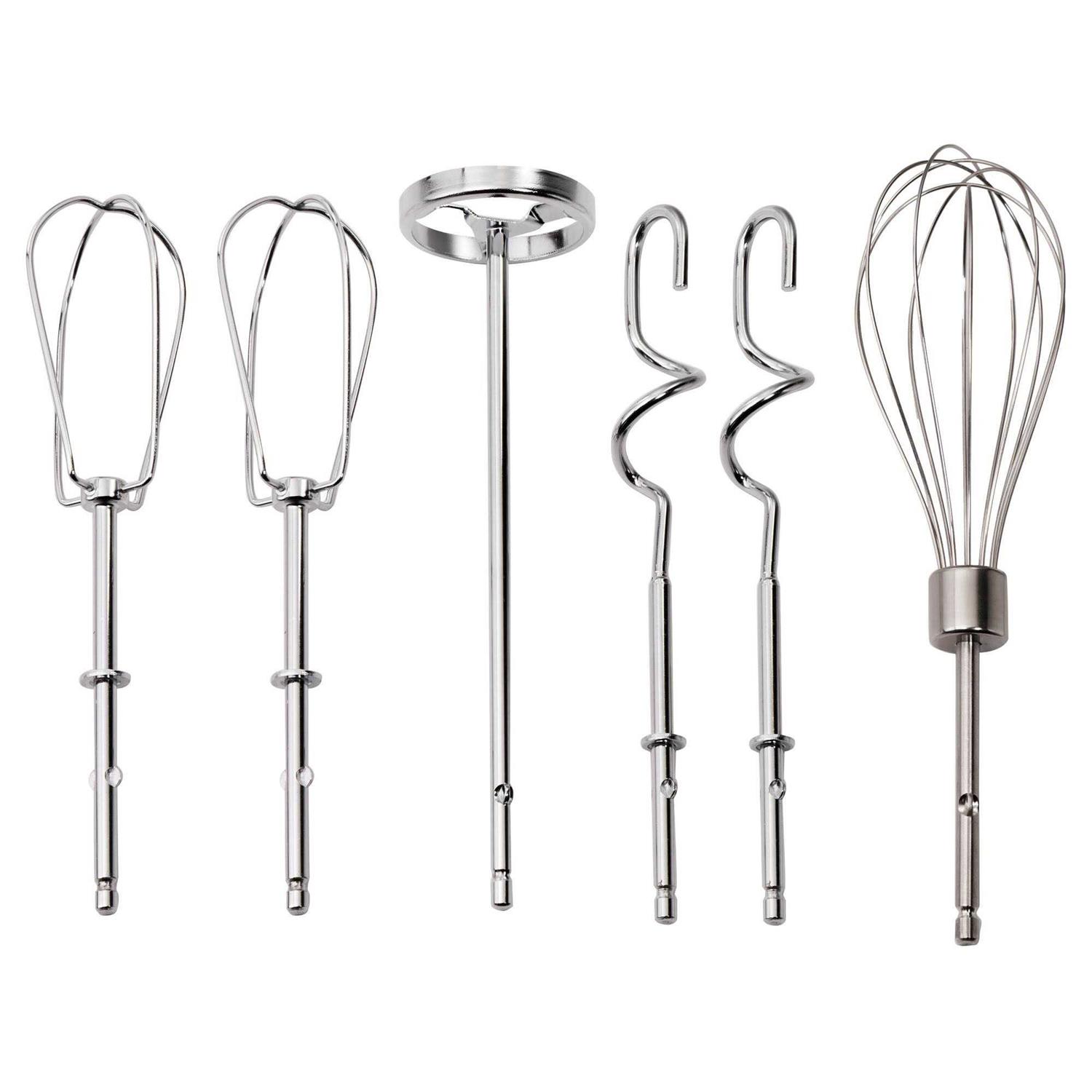 - 6 attachments included – twisted wire beaters, milkshake mixer, dough hooks and whisk