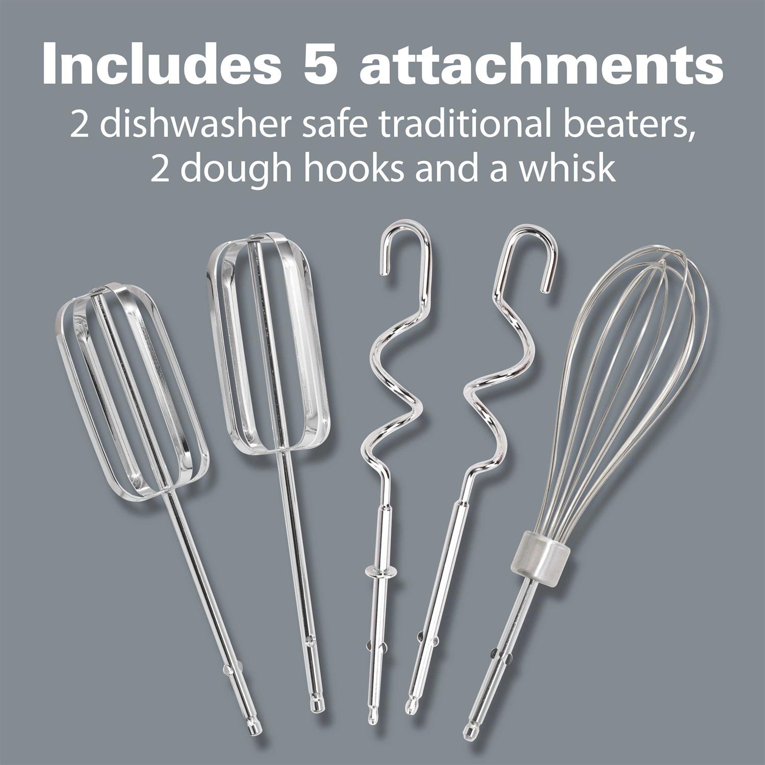 The Hamilton Beach Ensemble Hand Mixer adds a few conveniences to the common appliance. For one, it’s designed with a small bend near the back of it. That way you can rest it on the side of a bowl without the whole mixer slipping off. It’s a small detail, but it can help a lot when you don’t have a lot of countertop space to work with. An additional convenience is the snap on case. This case gives you a way of easily storing all of your beaters without filling up a separate utensil drawer. Given that this hand mixer comes with a set of traditional beaters, dough hooks, and whisks, a case like comes quite handy. The mixer itself can operate at 6 different speeds, allowing you start slow to avoid splatters and ramp up the power as needed. With that functionality, the Hamilton beach Ensemble Hand Mixer isn’t just a tool for great baking, but a user-friendly way to do it.