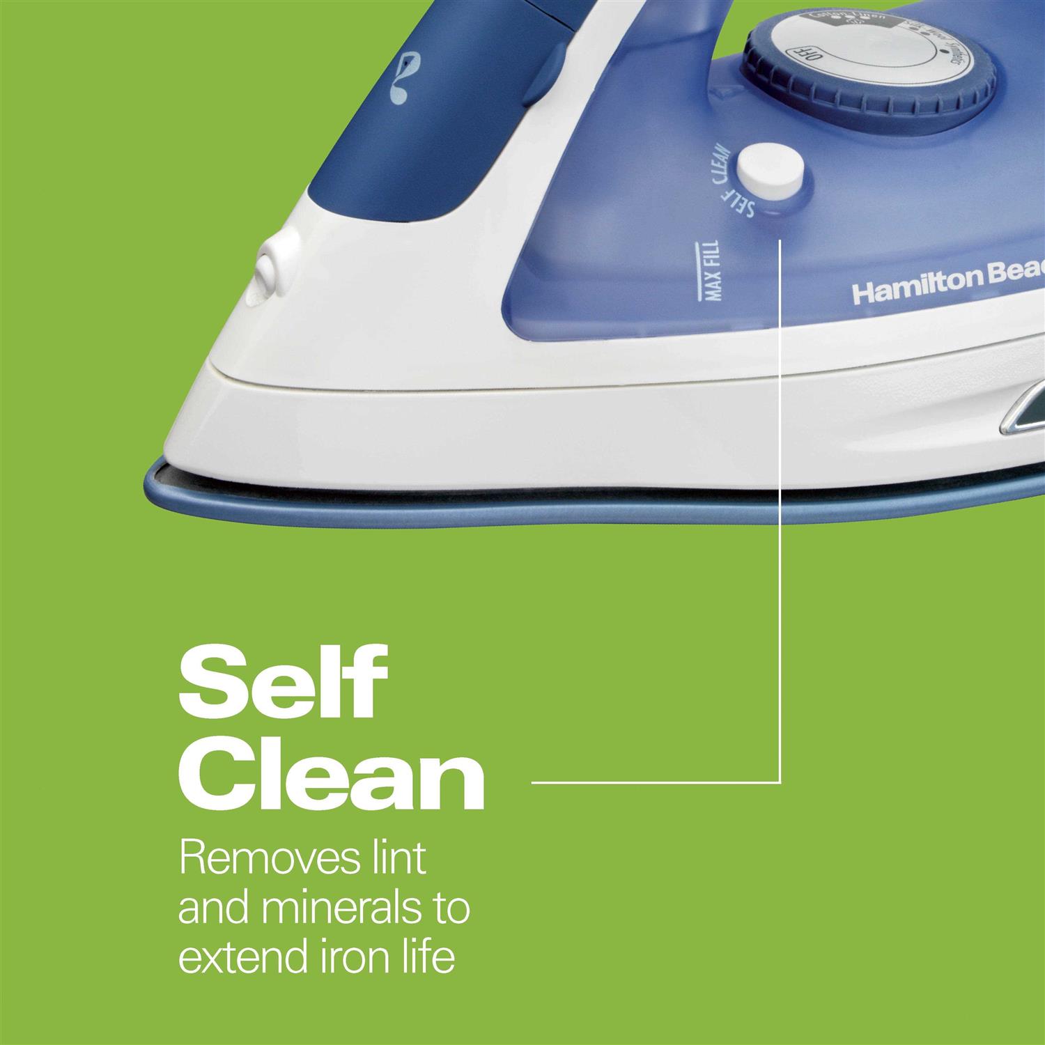 Eradicate the wrinkles from your wardrobe with the help of this Hamilton Beach Full-Size Durathon Iron. This electronic iron features an extra-large Durathon non-stick soleplate that moves smoothly over a wide array of fabrics. The Durathon iron delivers a powerful jet of steam that aids you in eliminating tough wrinkles and creating razor-sharp creases as needed. This non-stick iron also offers adjustable steam options to suit the kind of fabric being pressed. With the three-way auto shut-off feature, this Hamilton Beach iron ensures safety as well as reliable performance. Other highlights of this spray steam iron include an extra-long 10′ cord to provide greater maneuverability and reach and an auto-cleaning function. The iron also boasts anti-drip technology to keep your clothes looking fresh and tidy. The Hamilton Beach Full-Size Durathon Iron has a spray/blast button so you can apply the right amount of steam for each garment. The iron has an easy soft-touch grip.