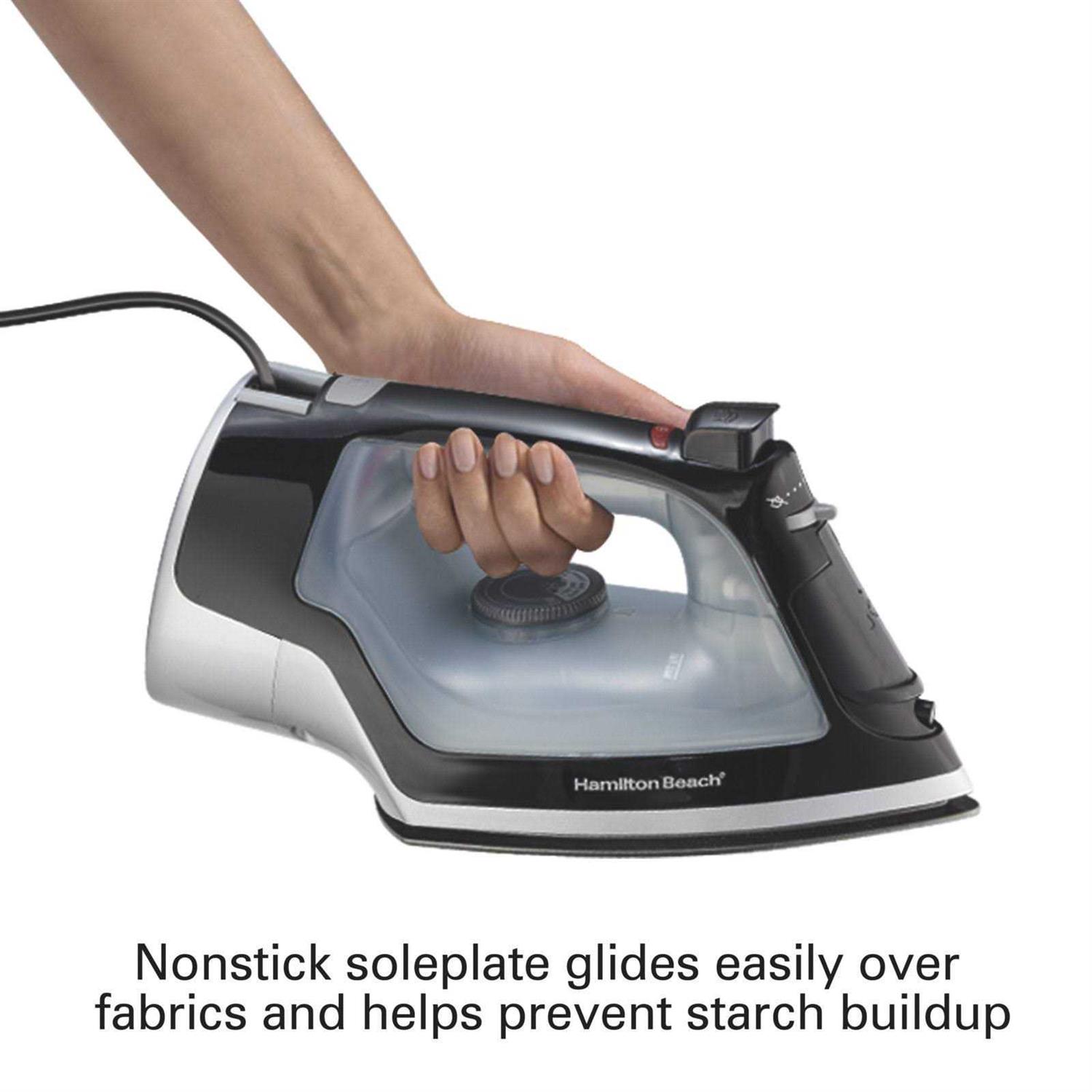 Ironing is easy with the Hamilton Beach Full-Size Nonstick Steam Iron. This durable iron has versatile steam options including vertical steam for freshening clothes and loosening wrinkles right on the hanger. The spray button is perfect for targeting stubborn wrinkles, while the blast button releases quick bursts of extra steam for steam ironing or vertical steaming. The iron’s adjustable steam switch lets you control the amount of steam you use for different fabrics. The convenient retractable cord keeps excess cord out of your way when ironing and makes it easy to neatly store the iron. The durable, nonstick soleplate smoothly glides across fabrics to get wrinkles out without sticking. Ironing is easy whether you’re pressing a delicate party dress or everyday cotton shirts. The iron has a front-mounted water tank opening that’s easy to fill, and the easy-view water window ensures you always know how much water is in the iron. The iron shuts off automatically after 1 hour and has a reset button that turns the iron back on and resets the timer. The iron has 8 fabric settings making it easy to select the right temperature for a variety of different fabrics.