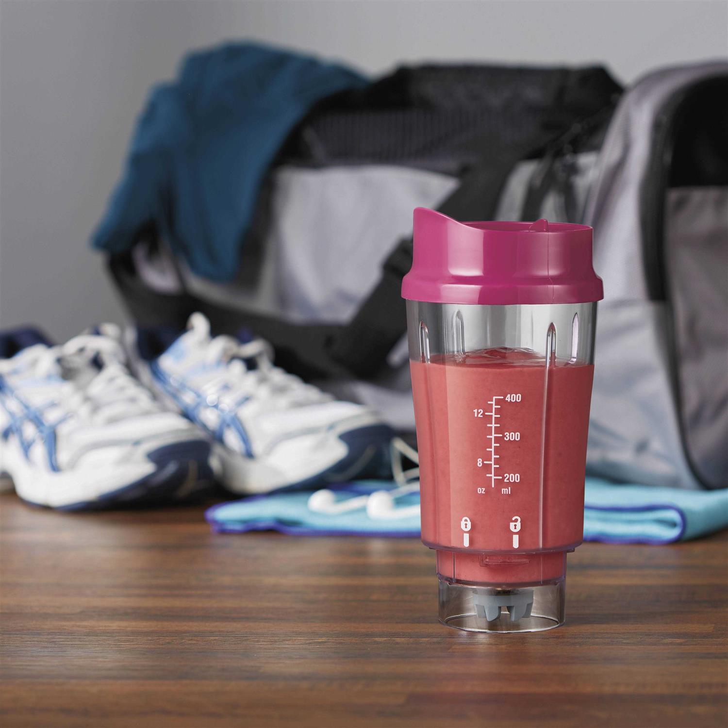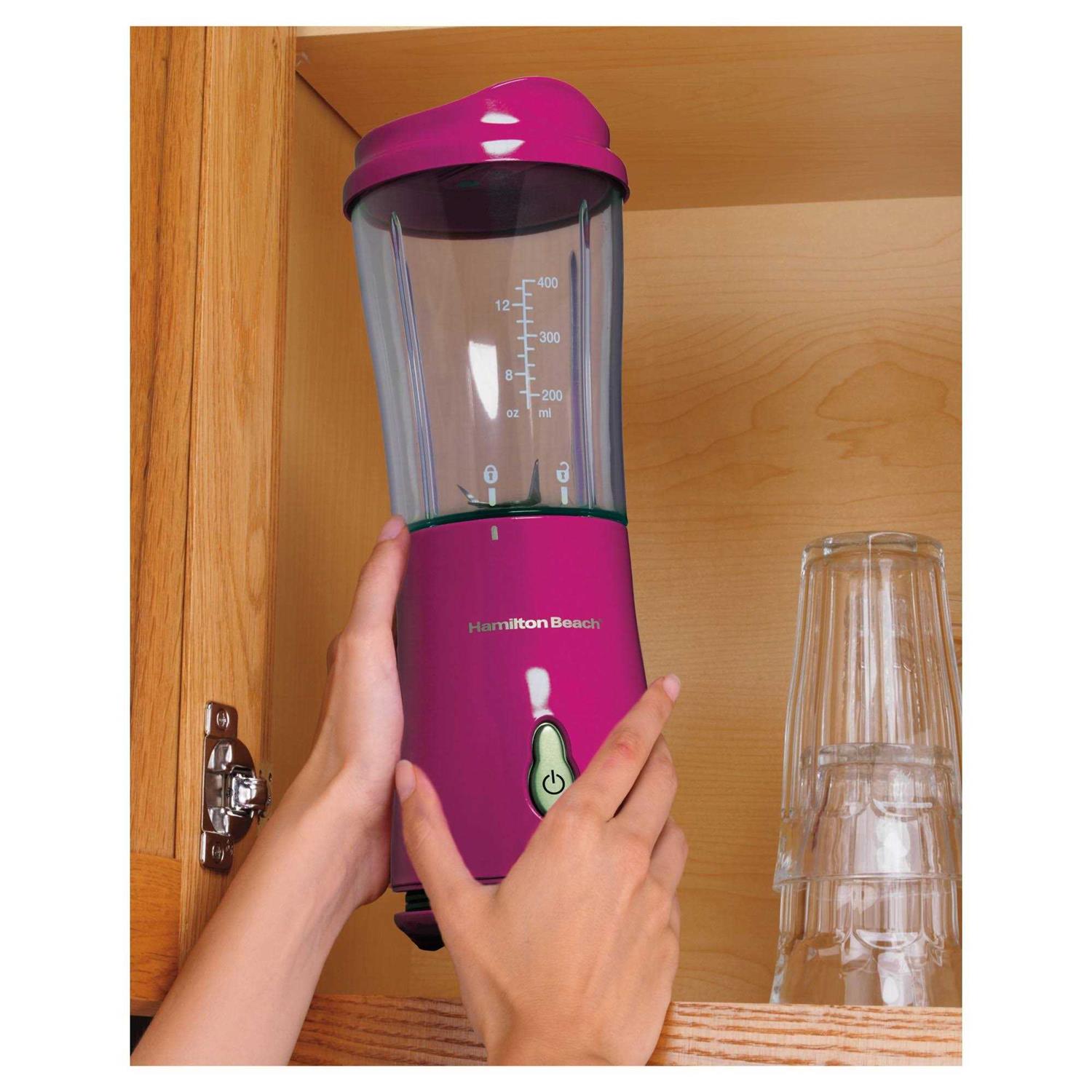 Make and take your morning drink with this single-serve blender from Hamilton Beach. Designed to double as a blender jar and cup, with a travel lid that lets you quickly grab and go, this compact appliance is perfect for getting shakes, smoothies and other favorites out the door. Size: 11.8 H x 3.94 W x 3.94 D. 14 oz jar.