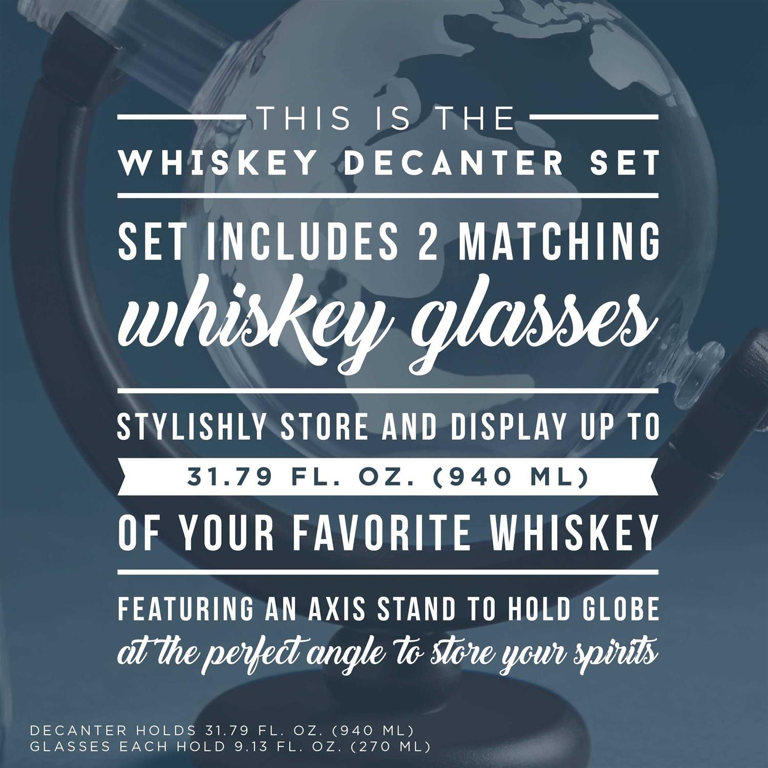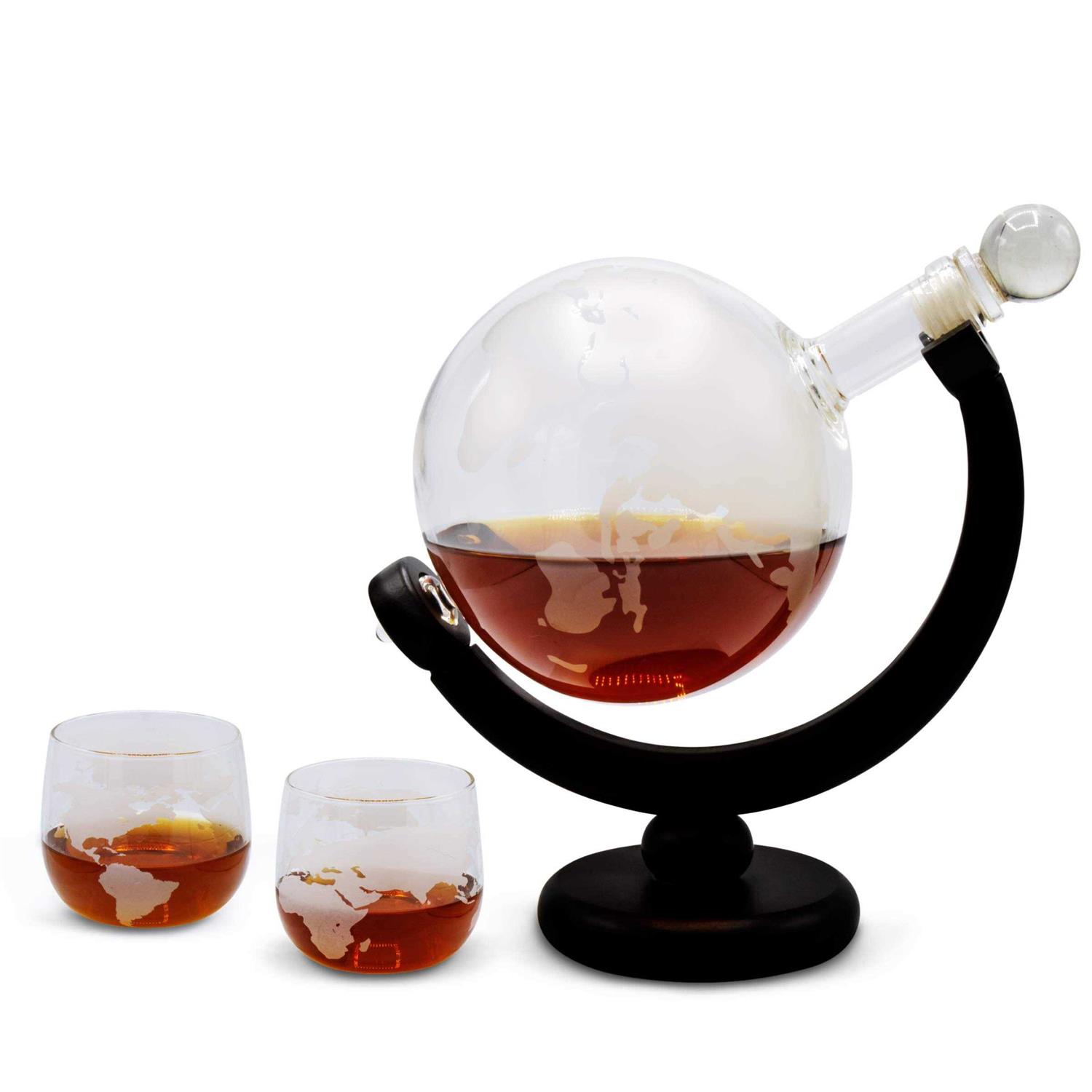 The Whiskey Decanter Set steps up the style of any bottle. This Earth-shaped decanter holds up to 850 mL of your favorite libations with a sophisticated look that seems more purposeful and planned on any shelf or table than just a random bottle of spirits. Turn your libations presentation into a world-class affair. The right decanter requires the right glasses to go with it. This decanter comes complete with two matching whiskey glasses, featuring the same world-map motif. So, you can sip while showing the world what true style is. Holding the decanter at just the right angle, the included dark-stained, solid wood stand finishes off the presentation. Its a complete set made for gifting that will show any whiskey lover you go the extra mile or 24,902.