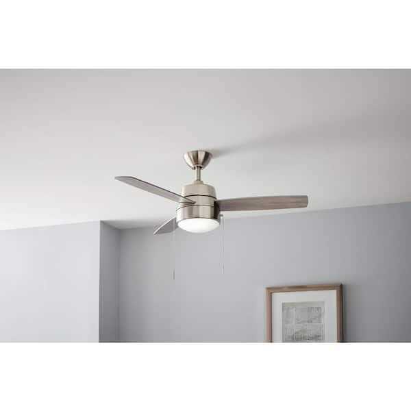 Ceiling fan offers a modern Brushed Nickel Finish with a frosted glass shade. The light kit includes an energy efficient 16-Watt integrated light source. The motor has 3 speeds with reverse capabilities for Winter and Summer modes.
