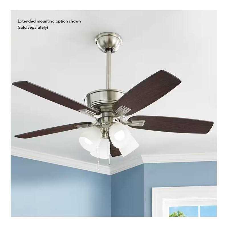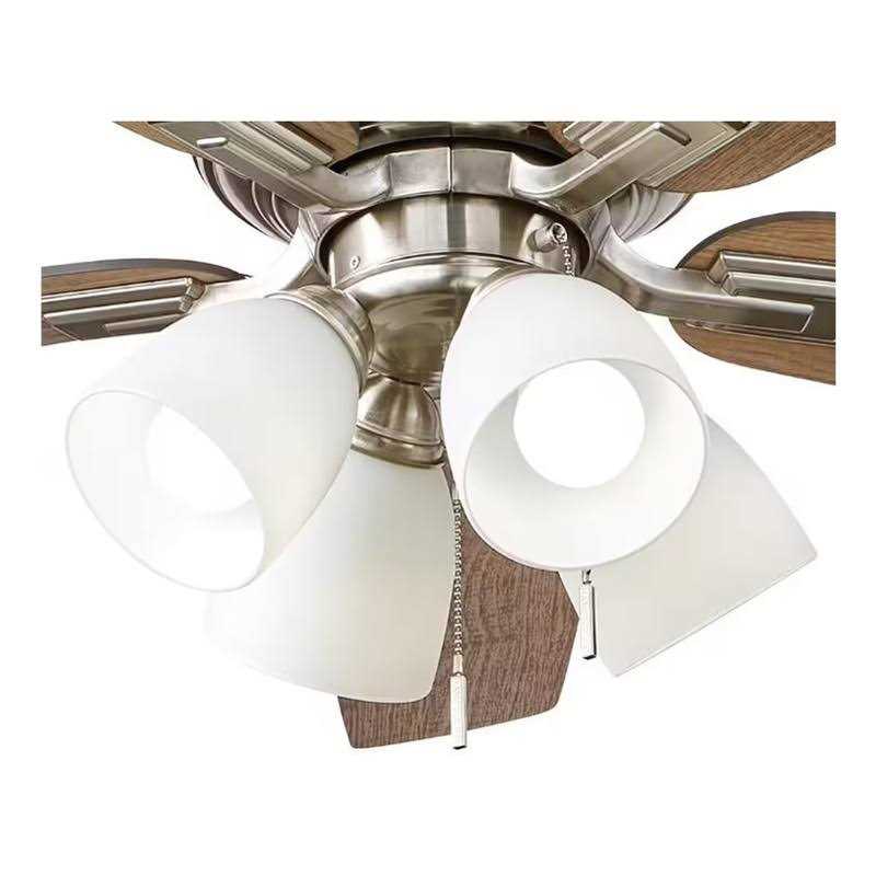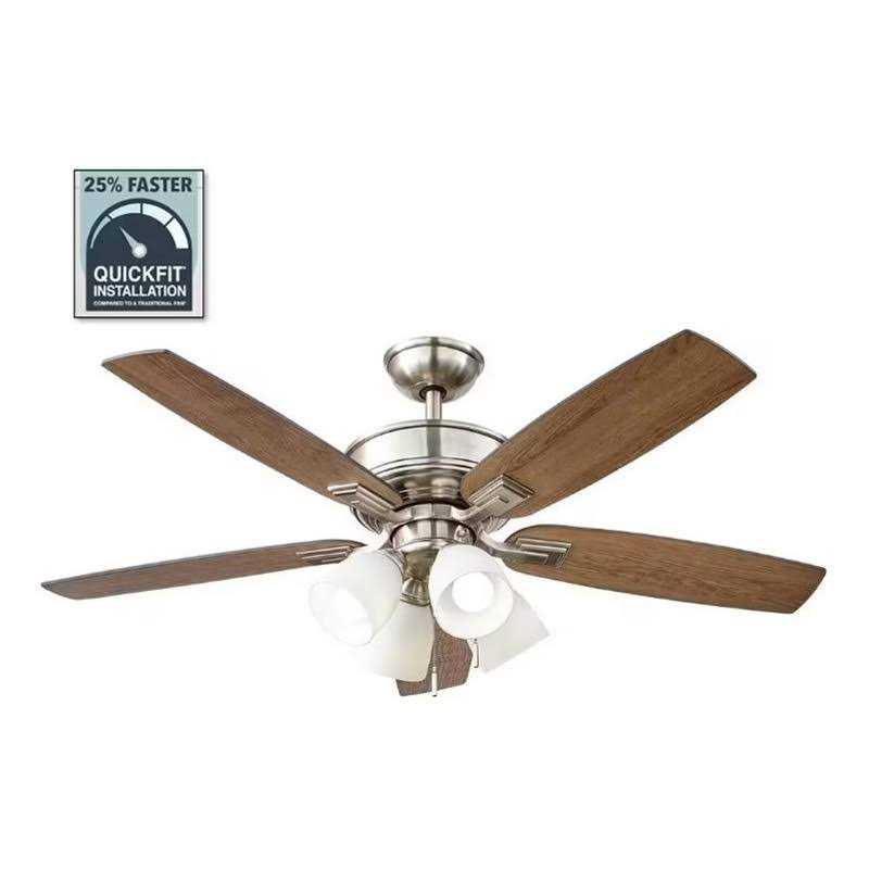 Devron II ceiling fan couples traditional elegance with design enhancements to deliver a fan that will look great for years to come. The Devron ceiling fan includes Quick Fit features like a slide-on mounting bracket, Quick Install blades and AccuArm blade arms to make installation a breeze. The 4-light light kit is designed for maximum illumination and includes four 9-Watt LED bulbs which last longer and use less energy than CFL or incandescent bulbs.