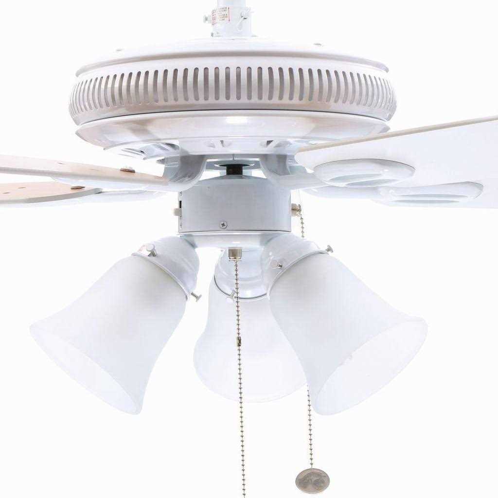 The Hampton Bay Glendale White Ceiling Fan is based on a traditional design but has been updated with more transitional features like vented housing and rounded blade arms. This ceiling fan offers a 3-light kit with frosted-glass shades and pull chains for easy operation. The blades are reversible and have white/bleached oak finishes that allow you to change the look of the ceiling fan without replacing the entire unit. Uses three 9.5-Watt LED bulbs included.