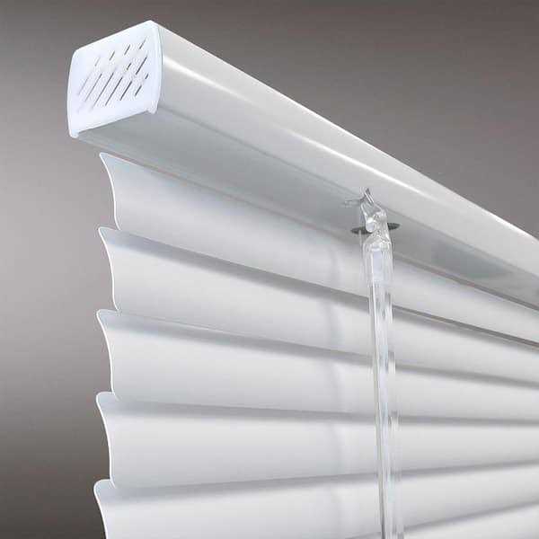 Cordless Vinyl Blinds by Hampton Bay are a safe and affordable choice to regulate light into any room. Vinyl blinds are resistant to heat and moisture, and are perfect for kitchens, bathrooms, and garages. The room darkening curved slats blocks 93% of light. These blinds are great for any home or office. For maximum light and privacy control, rotate the slats downward to ensure proper closure. Color: White.