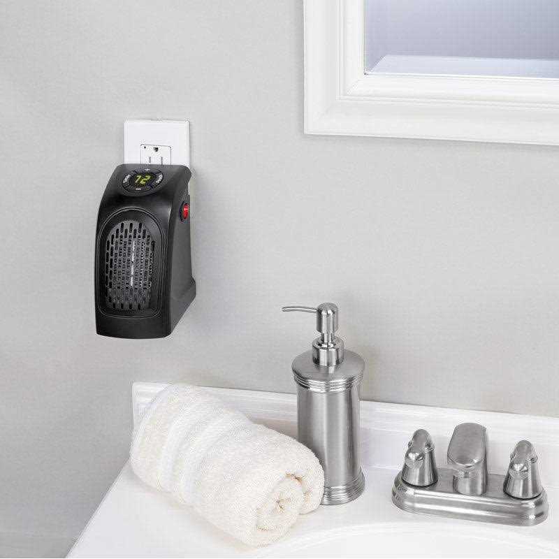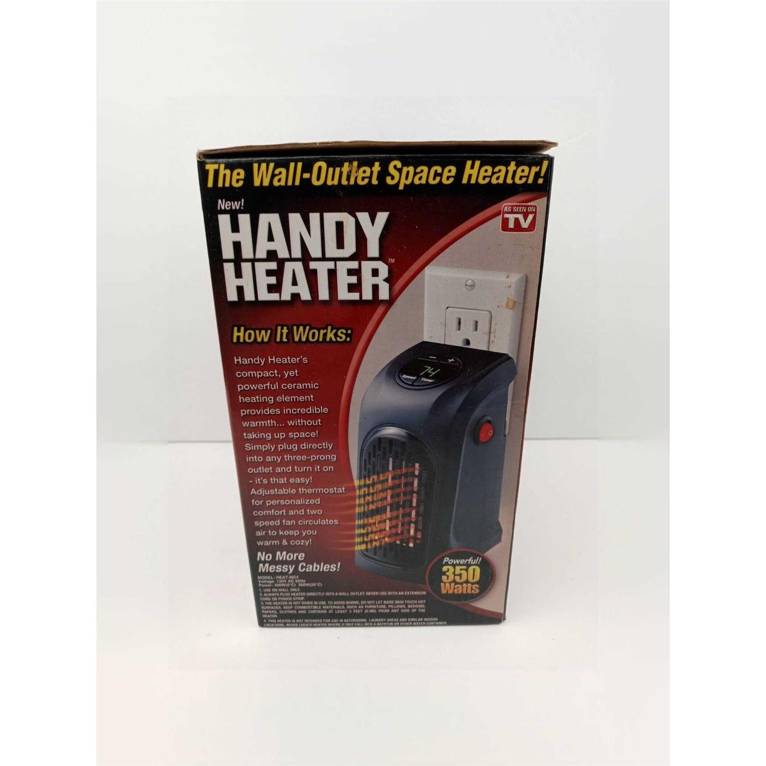 Handy Heater, As Seen on TV, is the personal heater that simply plugs into any wall outlet. This small yet powerful heater heats up to 250 sq ft. With 350 watt energy efficient heating element, Handy Heater creates a warm and cozy space without a high electric bill. Handy Heater includes an adjustable thermostat, 12-hour programmable timer, safe cermic heating element, staty-cool plastic housing, and auto shut off.
