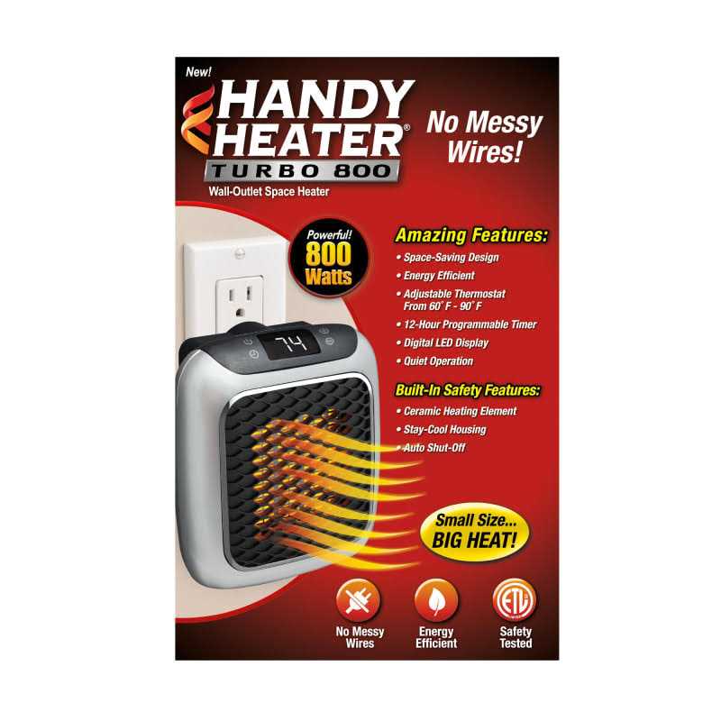 Introducing Handy Heater Turbo 800, the space-saving wall-outlet heater that plugs right into the wall and takes up no space at all! The compact, yet powerful ceramic heating element provides incredible warmth, transforming any cold and chilly space into a warm and cozy space! The powerful 800-watt unit is energy efficient and can help you save money! Simply plug Handy Heater Turbo 800 into any wall outlet, set the digital LED display to your ideal temperature, and feel your room get toasty and warm! Handy Heater Turbo 800 uses an adjustable thermostat that gives you exact temperature control, ranging from 60F – 90F. You can even keep your spot warm with the 12-hour programmable timer! Handy Heater Turbo 800 is perfect for any room in your home! Great for living rooms, dens, offices, kitchens, bathrooms, bedrooms, basements, and more! Best of all, Handy Heater Turbo 800s quiet operation allows you to relax or sleep without being disturbed. Handy Heater Turbo 800 has built-in safety features like the stay cool housing and auto shut off.