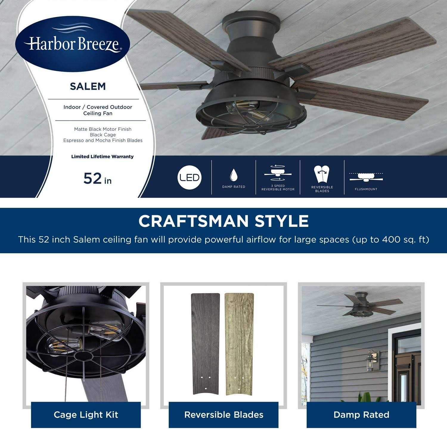 Harbor Breeze Salem 52-in Matte Black LED Indoor/Outdoor Flush Mount Ceiling Fan with Light (5-Blade) 42475