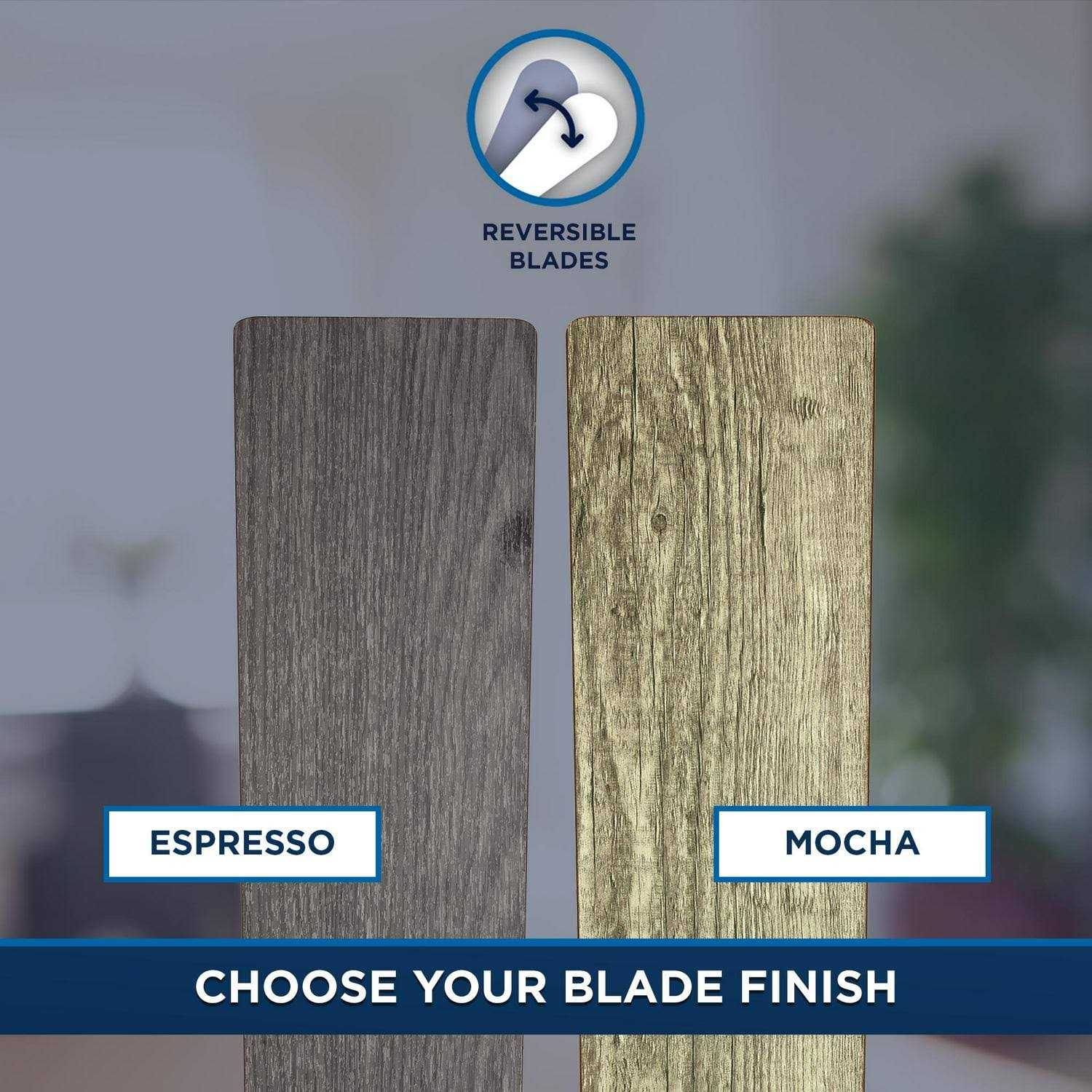 This fan is ETL listed for damp locations and can be hung both indoors as well as covered outdoor spaces such as porches, pergolas, garages and breezeways. With a blade span of 52 inches, this fan is perfect for medium to large sized rooms. Two easy-to-use pull chains are included for quick adjustments to the speed settings and light output. Low profile design to be mounted flush with the ceiling where more walk-through space is. Matte black finish complements 5 reversible espresso/mocha fan blades, making it easy to choose the look that’s just right for your space. Quiet, reversible 3 speed motor efficiently circulates cool air in the summer and warm air in the winter, cutting down on energy costs.