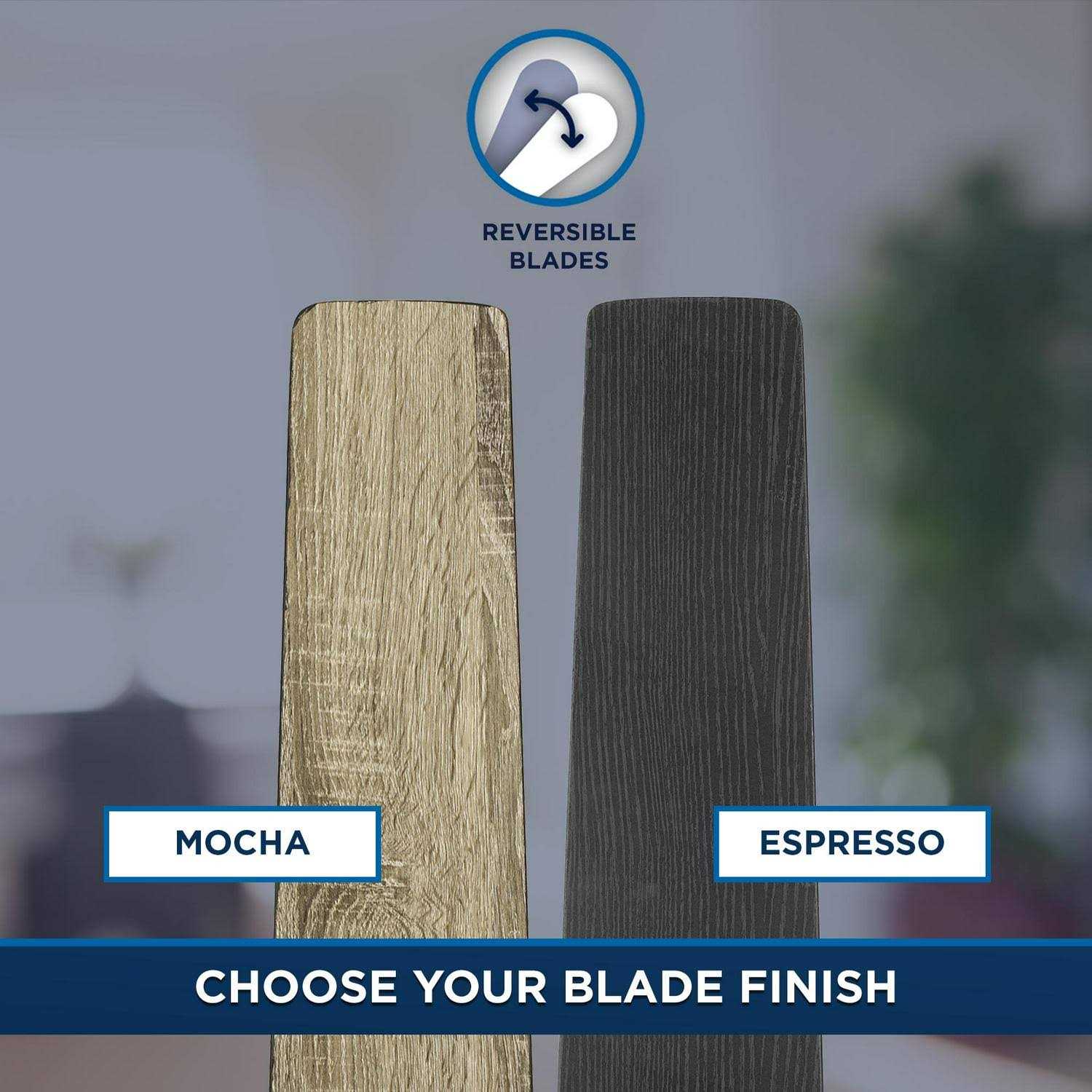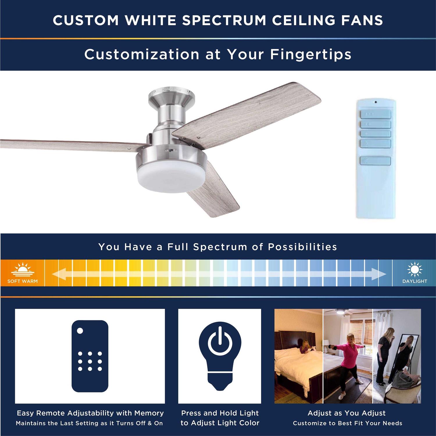 Custom White Spectrum technology features light color ranging from a warm white light to a bright white light. Adjust light between activities or by time of day- wake up with natural light, focus with bright white and wind down with a warm glow. Easily control the 3 speed settings, light output and color using the handheld remote included with the ceiling fan. Frosted glass houses integrated LED board with Custom White Spectrum technology featuring light color ranging from a warm white light (2200K), like a candlelight glow, to a bright white light, simulating daylight (6500K). With a blade span of 52 inches and airflow up to 4626 CFM, this indoor fan is perfect for medium to large sized rooms. Low profile design to be mounted flush with the ceiling where more walk-through space is. Matte black finish ceiling fan from the Mac collection features 3 reversible mocha/espresso blades so you can choose the right look for your home. Quiet, reversible motor efficiently circulates cool air in the summer and warm air in the winter, cutting down on energy costs.