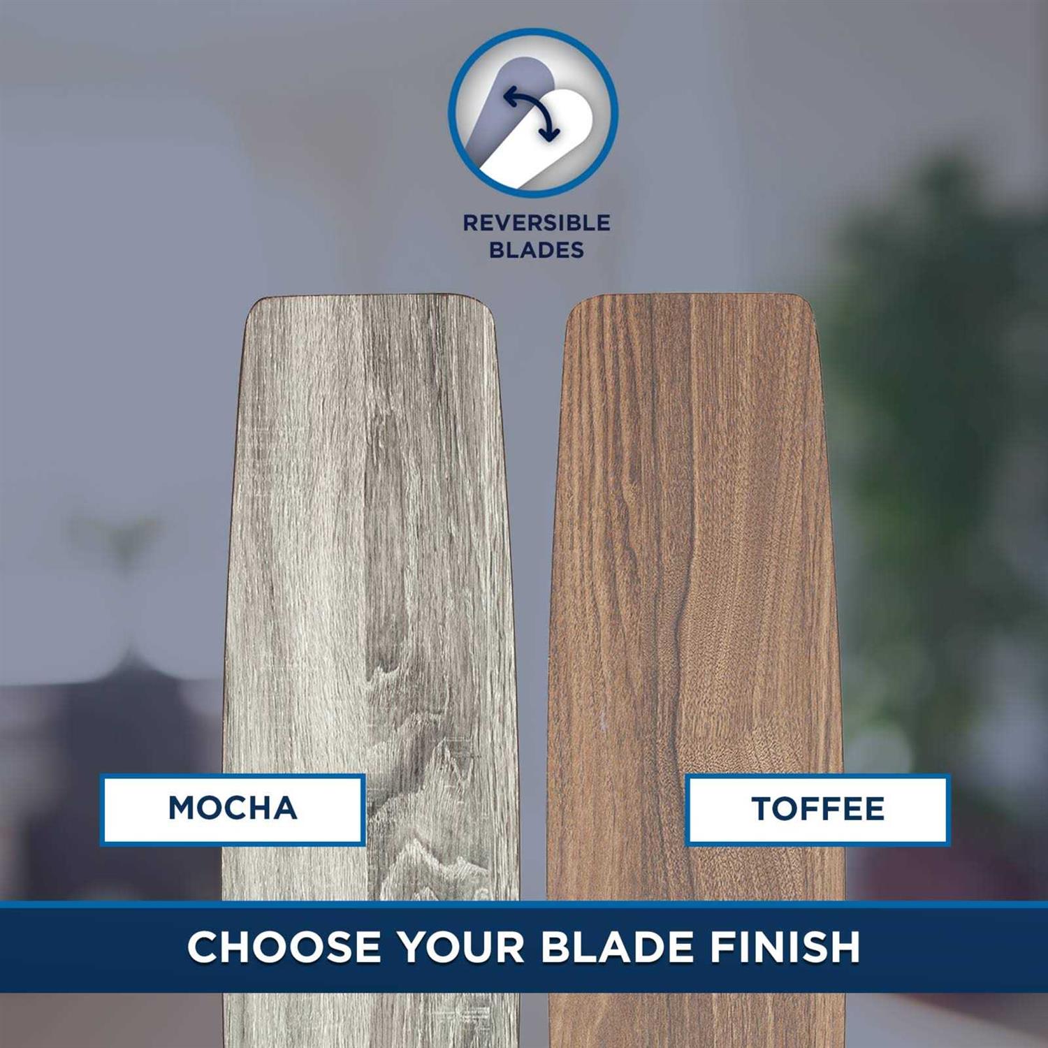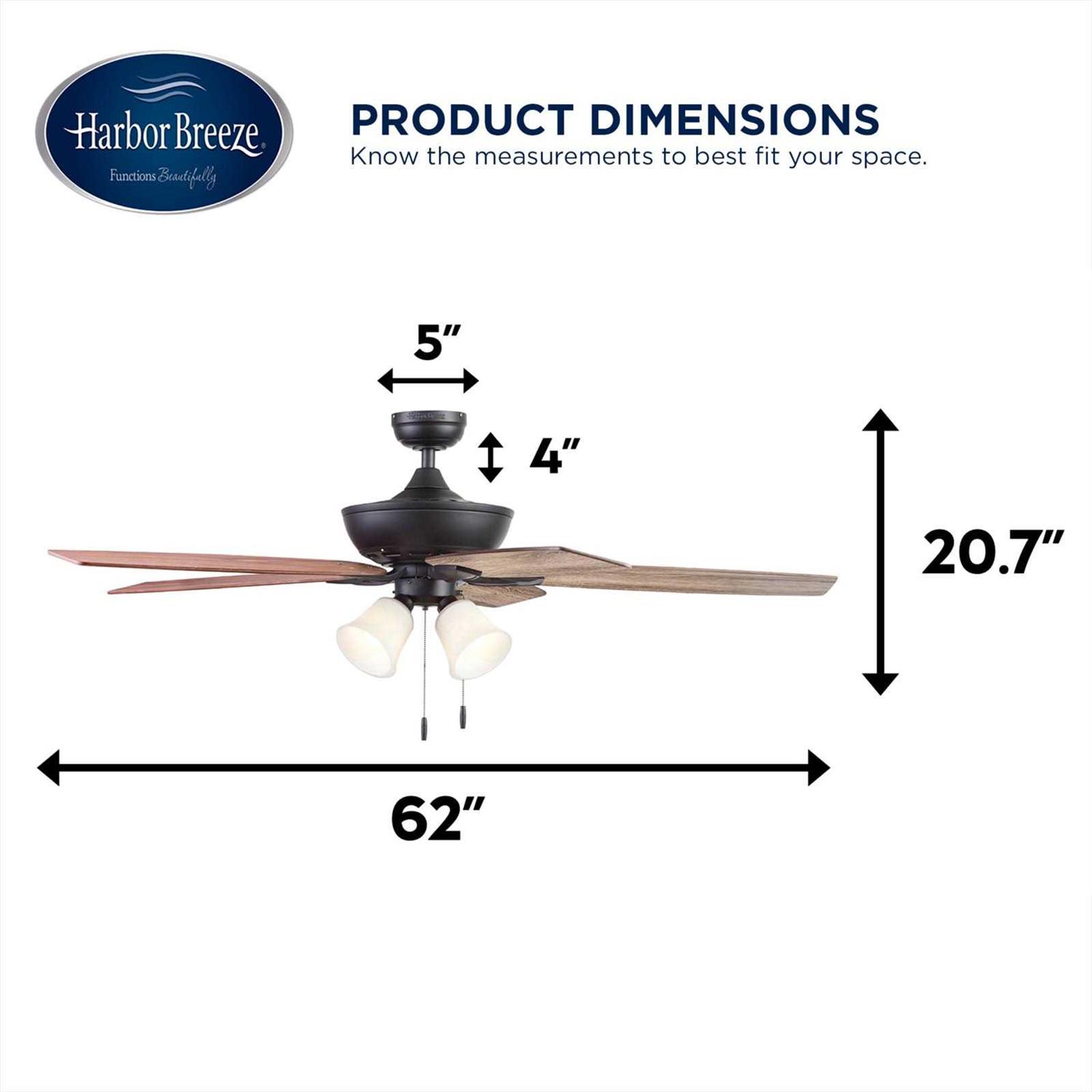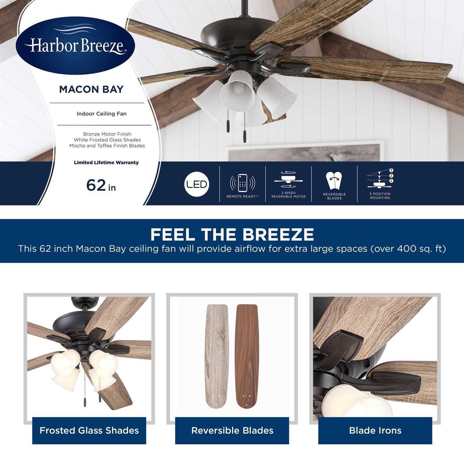 Mount close to the ceiling where more space is needed or from standard or angled ceilings with a 4-in downrod (included). Easy-to-use pull chains are included for quick adjustments to the 3 speed settings and light output. 4 Frosted white shades house E26/A15 dimmable LED bulbs (included). Bronze finish from the Macon Bay collection features 5 reversible mocha/toffee blades so you can choose the look that is just right for your home. 62-in fan provides airflow up to 5757 CFM, making it ideal for large to extra-large sized rooms. Quiet, reversible motor efficiently circulates cool air in the summer and warm air in the winter, cutting down on energy costs. Classic traditional style complements most decor styles.