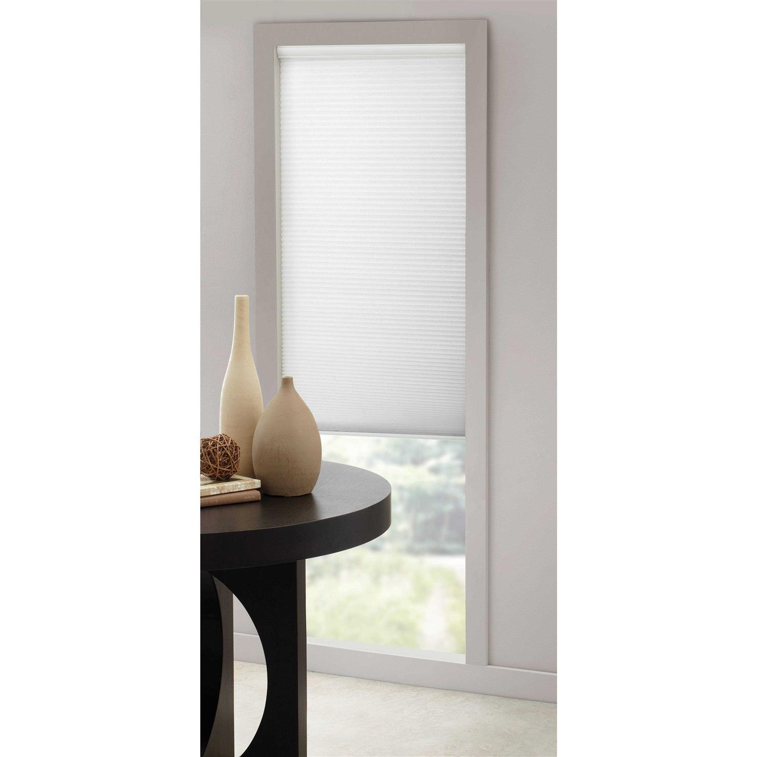 The Light Filtering Cordless Cellular Shade is energy efficient. Its honeycomb structures have cell pockets that trap air to help keep your space warmer or cooler no matter the climate. Sunlight is filtered into your room and you have privacy day or night. The shades are an excellent choice for any room or decor, and no cords to untangle. The cordless feature is much safer for your children and pets. Available in colors White or Ivory.