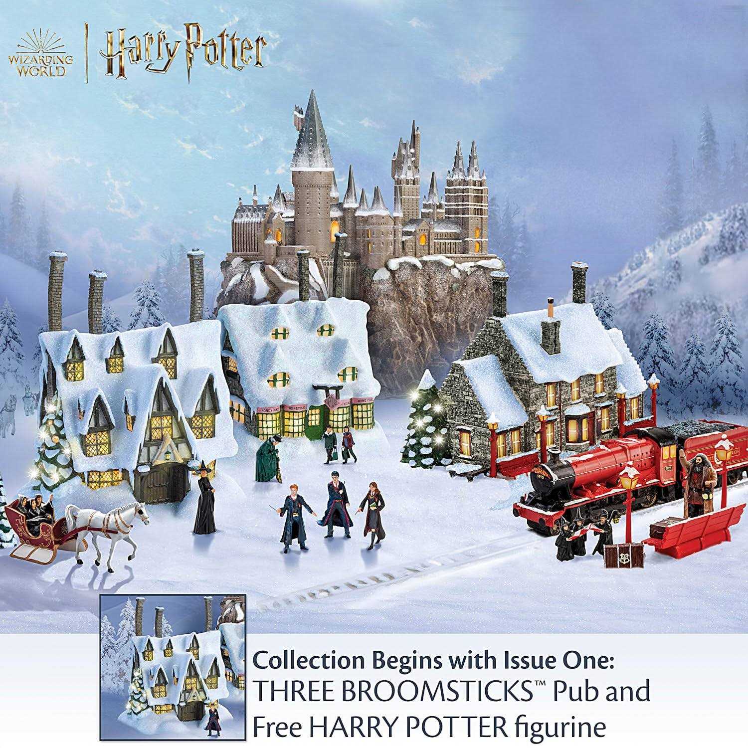 This exclusive collectible HARRY POTTER Village Collection from The Bradford Exchange features: Embrace the magical world of Harry Potter with the HARRY POTTER Village Collection, available from The Bradford Exchange, Hawthorne Village Division Officially licensed Illuminated villages and figurines are handcrafted and hand-painted to capture your favorite places and characters from the films It lights up! The fully-sculpted buildings in this village collection light up to create an enchanting and magical scene Includes FREE figurines – a $60 value HARRY POTTER collectible village makes a great decoration and a fantastic fan gift Certificates of Authenticity HOGWARTS Castle measures 8″ W x 8″ H x 8″ D; 20.3 cm W x 20.3 cm H x 20.3 cm D; buildings range in size from 6-1/2″ to 7″ H; 16.5 cm to 17.8 cm H; figurines measure up to 2″ H; 5.1 cm H