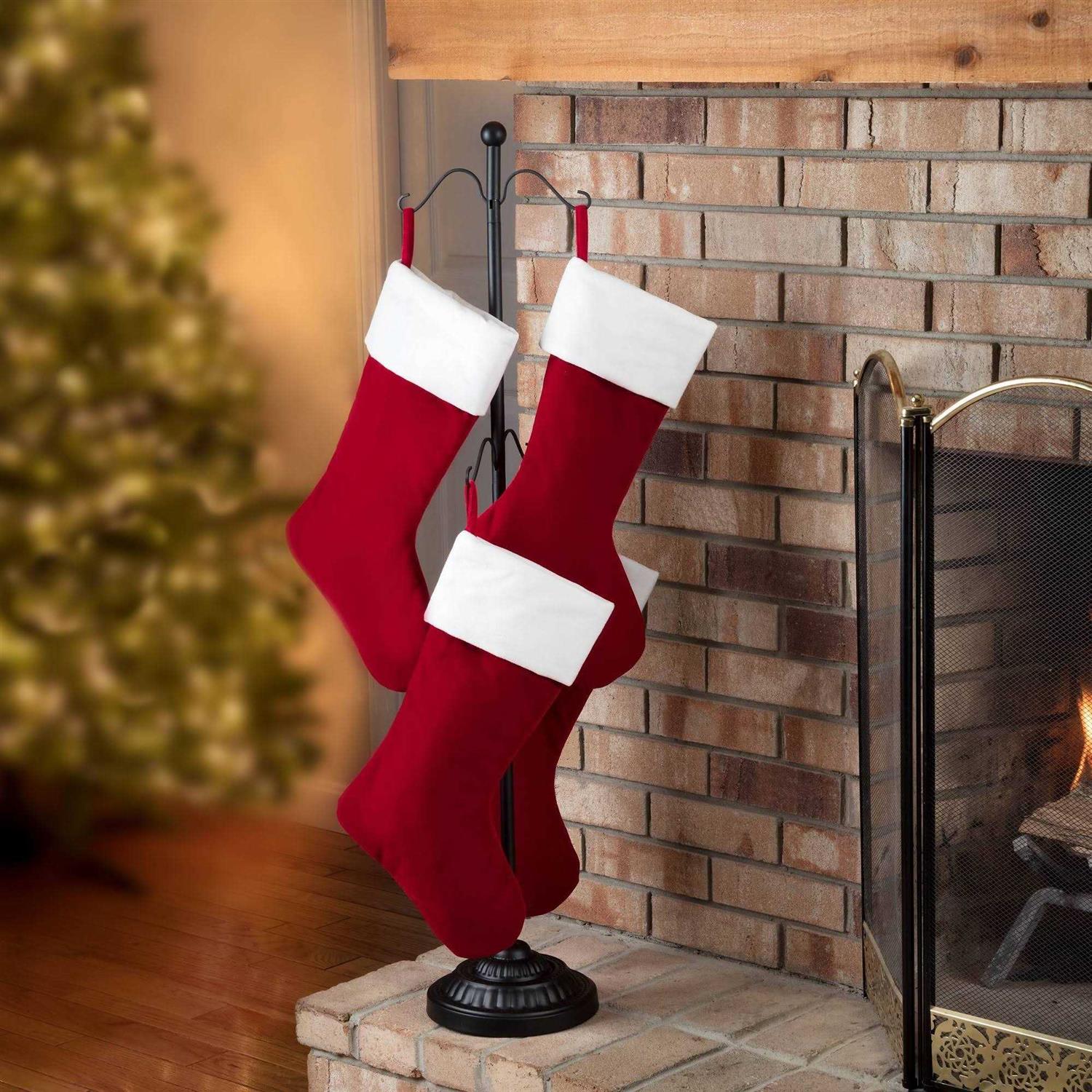 The Adjustable Stocking Tree offers a unique solution for hanging Christmas stockings where there is no mantel. This stocking tree features two rows of hooks for hanging stockings and the option to place the tree just about anywhere you want it. The stocking tree height adjusts from 19 to 42 inches and provides the option for a single or double row of stockings; plenty of room to accommodate a variety of families. The single rod holds up to 4 stockings and can sit on a tabletop or small space while the 42- inch size holds up to 8 stockings and allow you to set it on the floor or hearth. Includes a durable and sturdy weighted base. Black finish. Indoor use. Base measures at 8.25-inch diameter. Total height is 42 inches High at full extension. Total weight is 4.64 pounds.