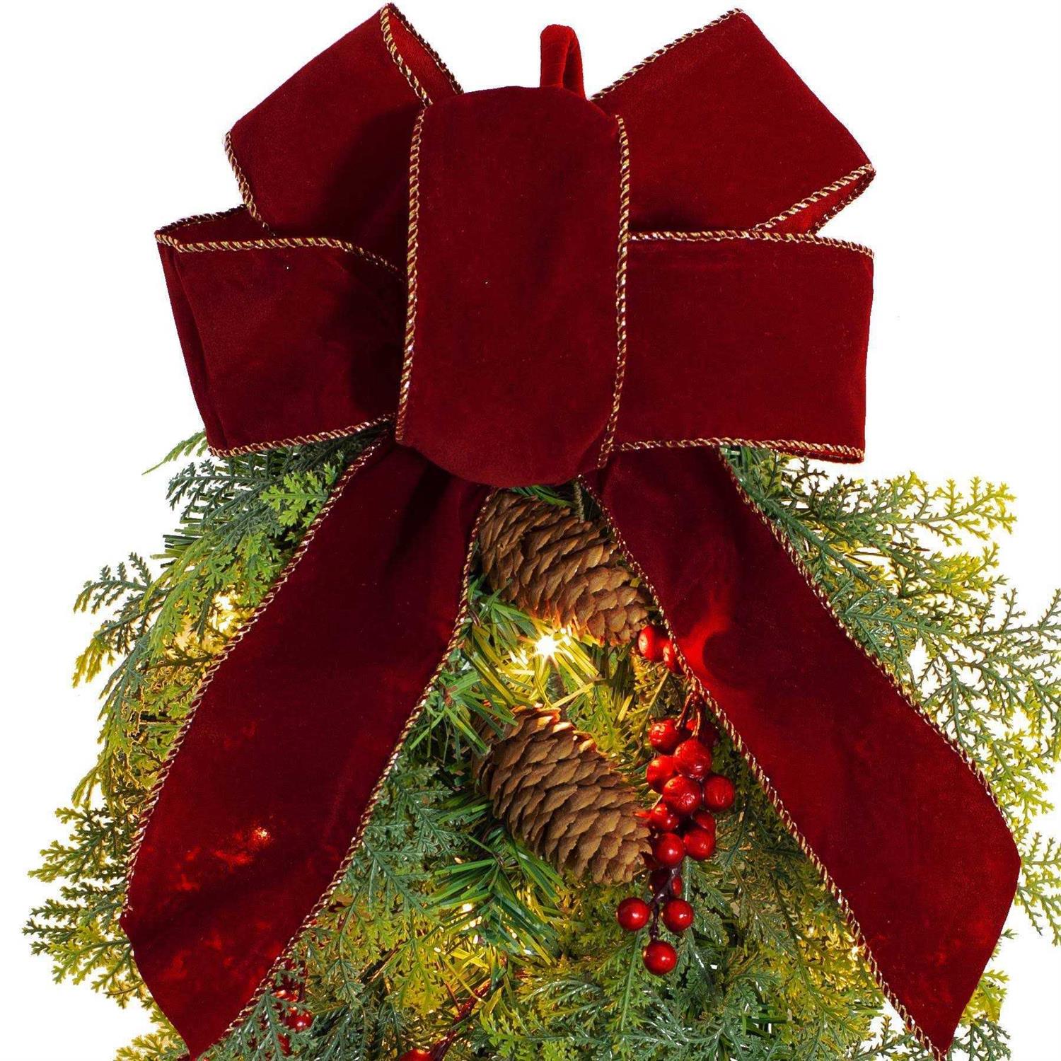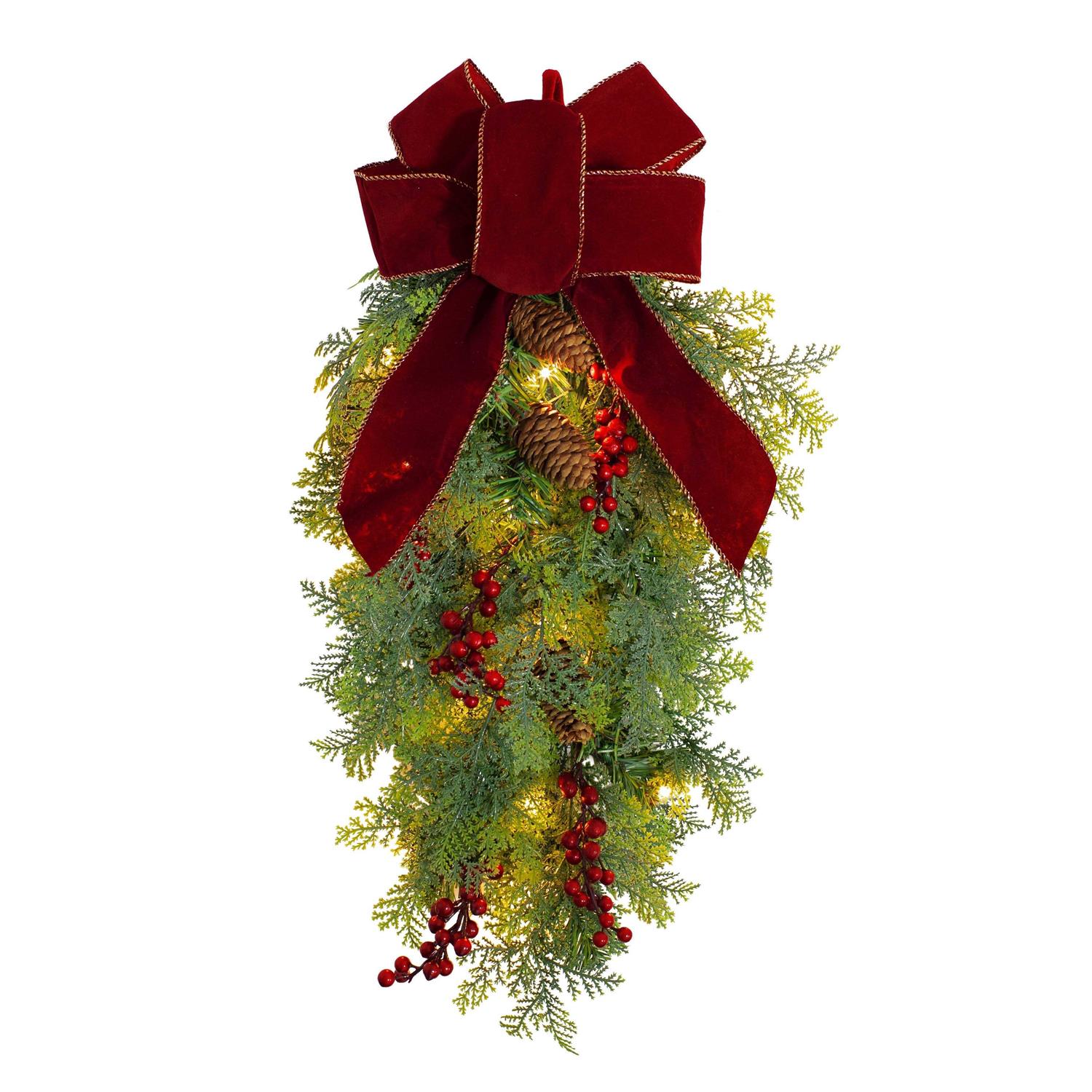 Add a beautiful Christmas swag to the back of any chair. This chairback swag features an assortment of PE/PVC lush, mixed greenery, faux berries, and real pinecones. Pre-lit with 15 warm white LED lights, this swag shines brighter than most and has a battery box that contains a built-in timer function that starts a countdown when turned on which runs 6-hours on and 18-hours off. The PE/PVC mixed greenery comes with a velvet covered hook for easy hanging on either the back of a chair or staircase railing. A beautiful weather safe red velvet bow is the finishing touch to this Chairback Swag. Requires 3 AA batteries- not included. Perfect for indoor and outdoor use, Measures 14 in. W x 4 in. D x 20 in. H. 31 tips (45% PVC/ 10% PE).