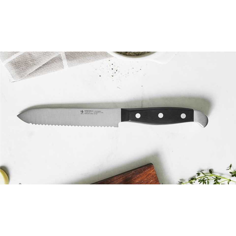 Henckels International makes essential kitchen tools that every home chef needs. Created in 1895, this time-honored brand offers high quality at an exceptional value. Sharpness is always in reach with Henckels International Self-Sharpening Graphite Knife Blocks. The self-sharpening slots boast built-in ceramic honing wheels that automatically sharpen when knives are stored or removed. The remaining slots are for serrated knives, whose toothed blades never need sharpening. With these must-have knife blocks, enjoy effortless sharpness for precise prep work every time. Plus, their handsome stained ash wood base and stainless steel cap add aesthetic appeal to your countertop. Tailor-made for J.A. Henckels International Graphite knives, these blocks help you maintain the superior sharpness of their fine edge, precision-honed blades. With a seamless transition from blade to handle, the knives’ fully forged construction provides balance while their traditional triple-rivet handle encourages tireless cutting.