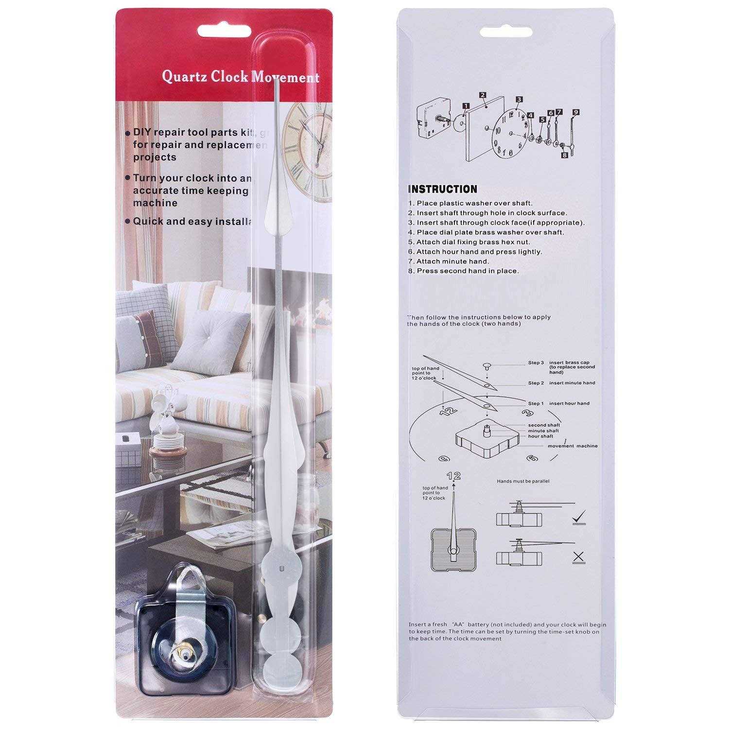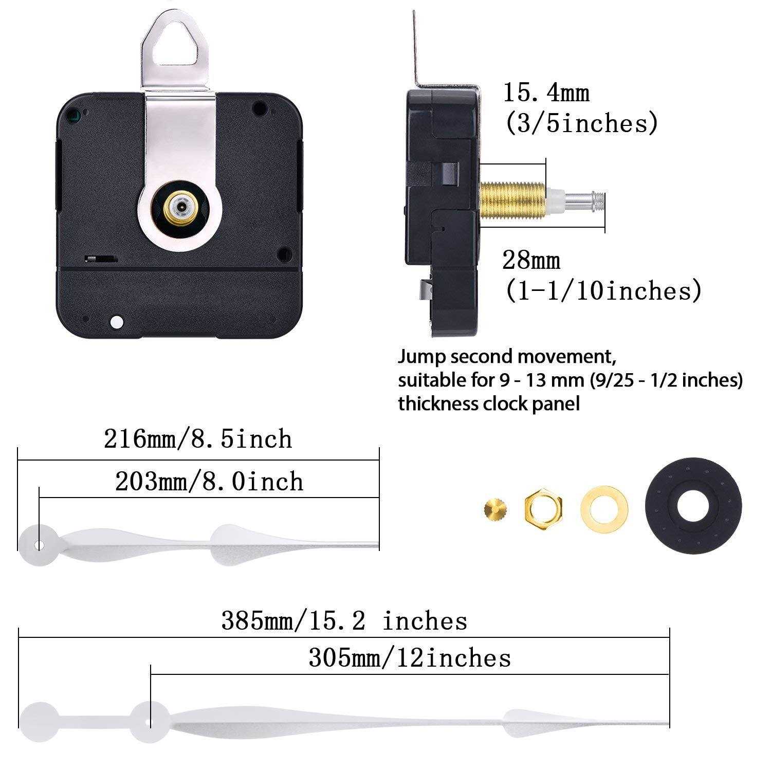 Clock Movements by Hicarer. Details:High torque long shaft clock movement mechanism with 12 inch long spade hands Kindly reminder: There is a printing mistake in the instruction. The 8th instruction is wrong. Our package does not include screw minute nut. Features: Total shaft length is 28 mm and its thread length is 15.4 mm, applicable for 9 – 13 mm (9/ 25 – 1/ 2 inches) thickness clock panel. Application: You can use the clock movement to repair, replace or make a clock, suitable for cross-stitch, three-dimensional embroidery, craft clock, frameless draw clock, etc.. Easy and simple design: The component parts are easy to assemble together and the pure color metal hands can be painted with any color to match your clock. Specifications: Material: plastic and aluminum Case size: approx. 55 x 55 x 16 mm (2.2 x 2.2 x 0.63 inches) Hour hand length: total length is 216 mm/ 8.5 inch. Center hole to the tip is 203 mm/ 8.0 inch Minute hand length: total length is 385 mm/ 15.2 inch….