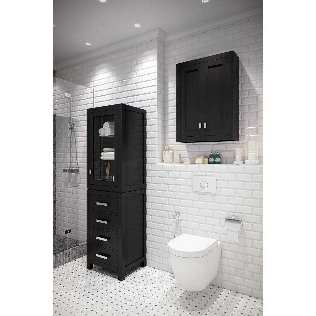 This wall-mounted, 2-door bathroom cabinet saves you space while creating functional storage. It’s crafted from solid birch wood and has a rectangular shape with clean lines. The design features picture frame paneling and minimalist knobs in a silver chrome hue. It’s wall-mounted, so it’s ideal for just over the toilet, saving you floor space.