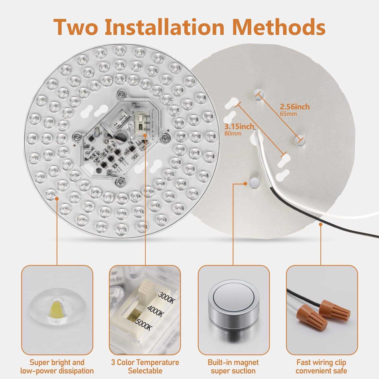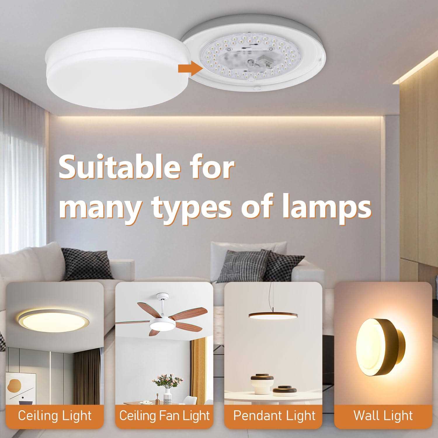 Wide Application: This ceiling fan LED light replacement kit can replace ceiling light, ceiling fan light, pendant light, thread type ceiling lamp, surface mount ceiling lamp, wall light Money & Energy Saving: This led ceiling light retrofit kit with more than 4000 LM output and 88% energy saving and generate extremely low heat, 400 watt equivalent to the fluorescent light 3 CCT Available: No longer have to wonder about which color temperature to choose in your home! There is a DIP switch on each led replacement kit, you can preset your preferred light color temperature: 3000K warm white / 4000K neutral light / 5000K daylight 10-100% Dimmable: The LED light engine retrofit kit suitable for most LED dimmers on the market, and realize the smooth adjustment of brightness from 10% to 100%, so that you can use the light board in many areas, such as living room, bedroom, hallway, bathroom, kitchen, closet, restaurant, basement, office, etc Easy Installation: There are two ways to install the LED light engine for this ceiling fan. If the base of your light is made of iron, you can use the existing magnets to attach it; plastic or other material chassis can be installed using the screws included in the package Long Lifespan: This round LED light panel replacement use high-end LED lamp beads longer service life. Lifespan 50,000 hours which means ceiling fan light kits can be used for 17 years based on 8 hours/day. With three different color temperature options (3000K/4000K/5000K), you can customize your lighting to suit any mood or occasion. The dimmable feature allows you to adjust the brightness to your desired level, creating the perfect ambiance for any room. This retrofit kit is easy to install and is compatible with most ceiling fans, making it a versatile and convenient lighting solution for your home.