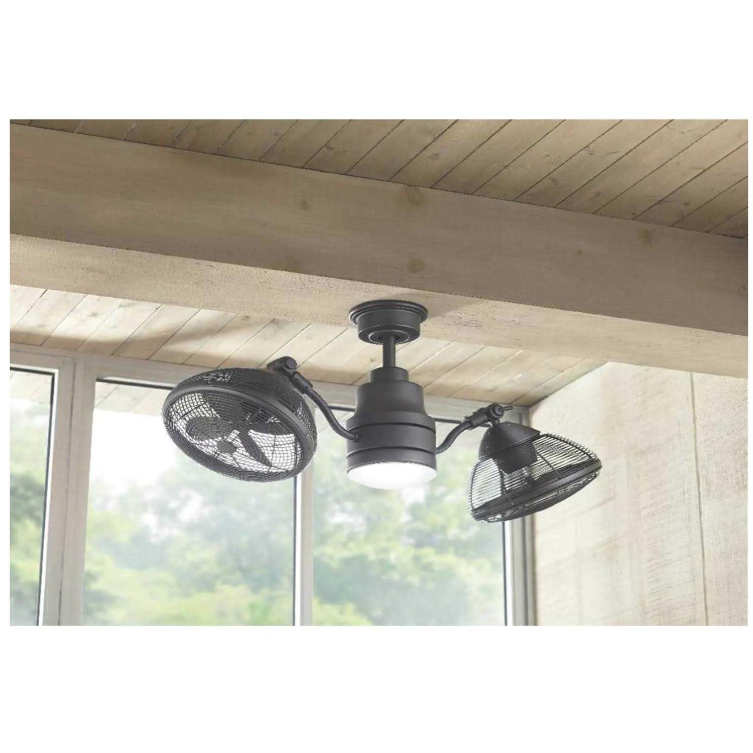LED Espresso Bronze Ceiling Fan has a unique dual cage design that can oscillate in both directions. The light kit has a 14-Watt LED Samsung module that is set at 3000K color temperature for an incandescent feel which is also dimmable.