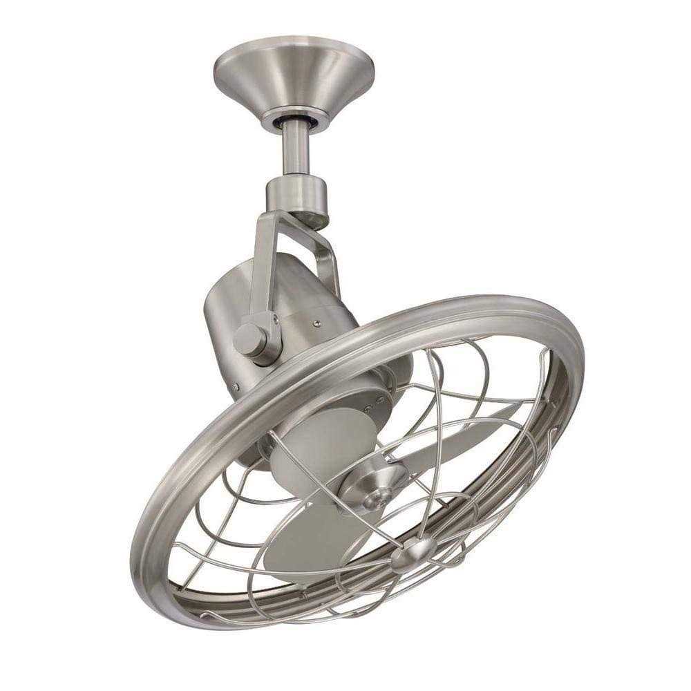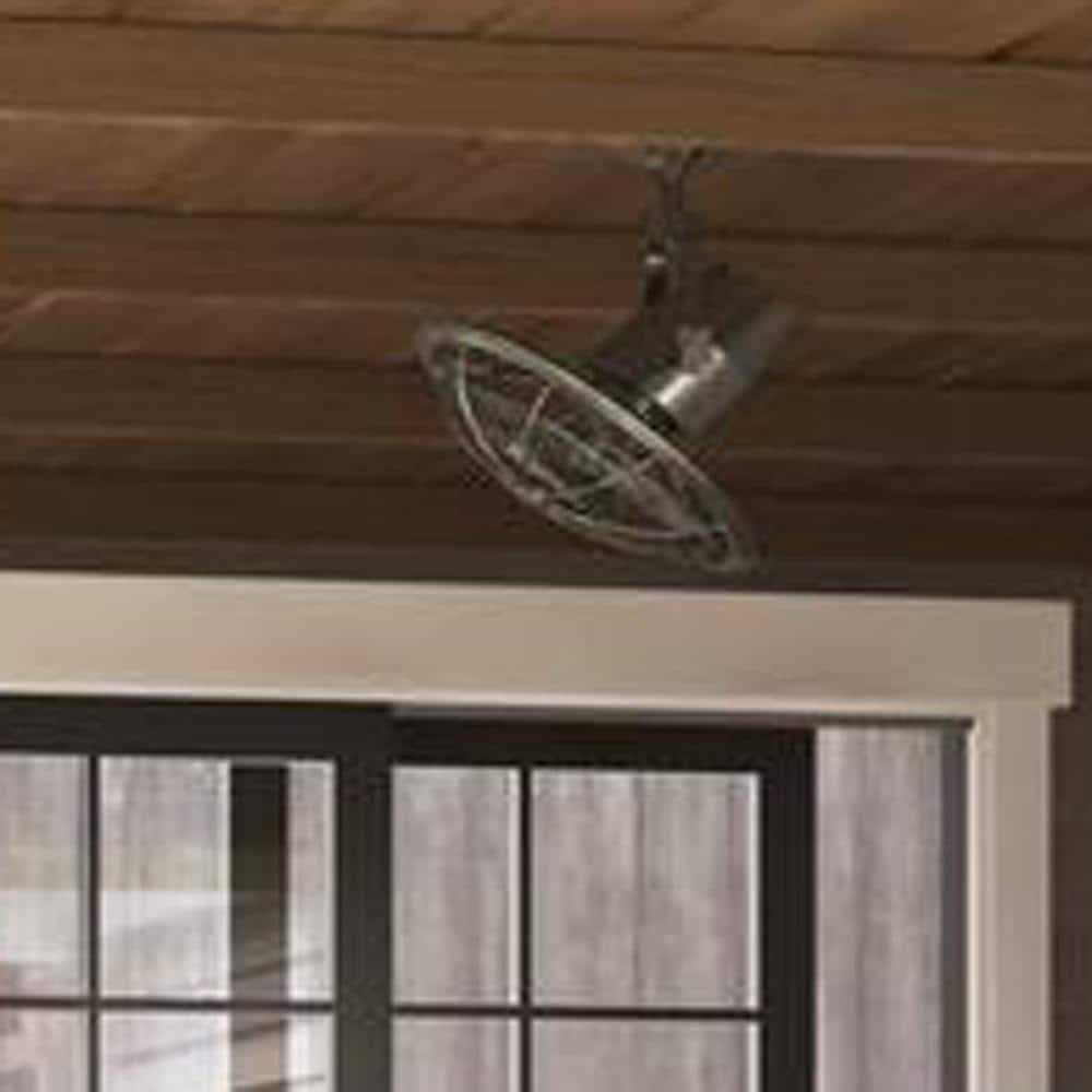 Indoor/Outdoor Brushed Nickel Oscillating Ceiling Fan with wall control has a caged fan design and is great when air circulation needs to be directed or if space is tight. It also has an oscillating feature that sways back and forth, creating a nice breeze. Both fan speed and oscillation can be control by the handy wall control. This fan is also rated for damp locations so it can be used under covered outdoor locations.