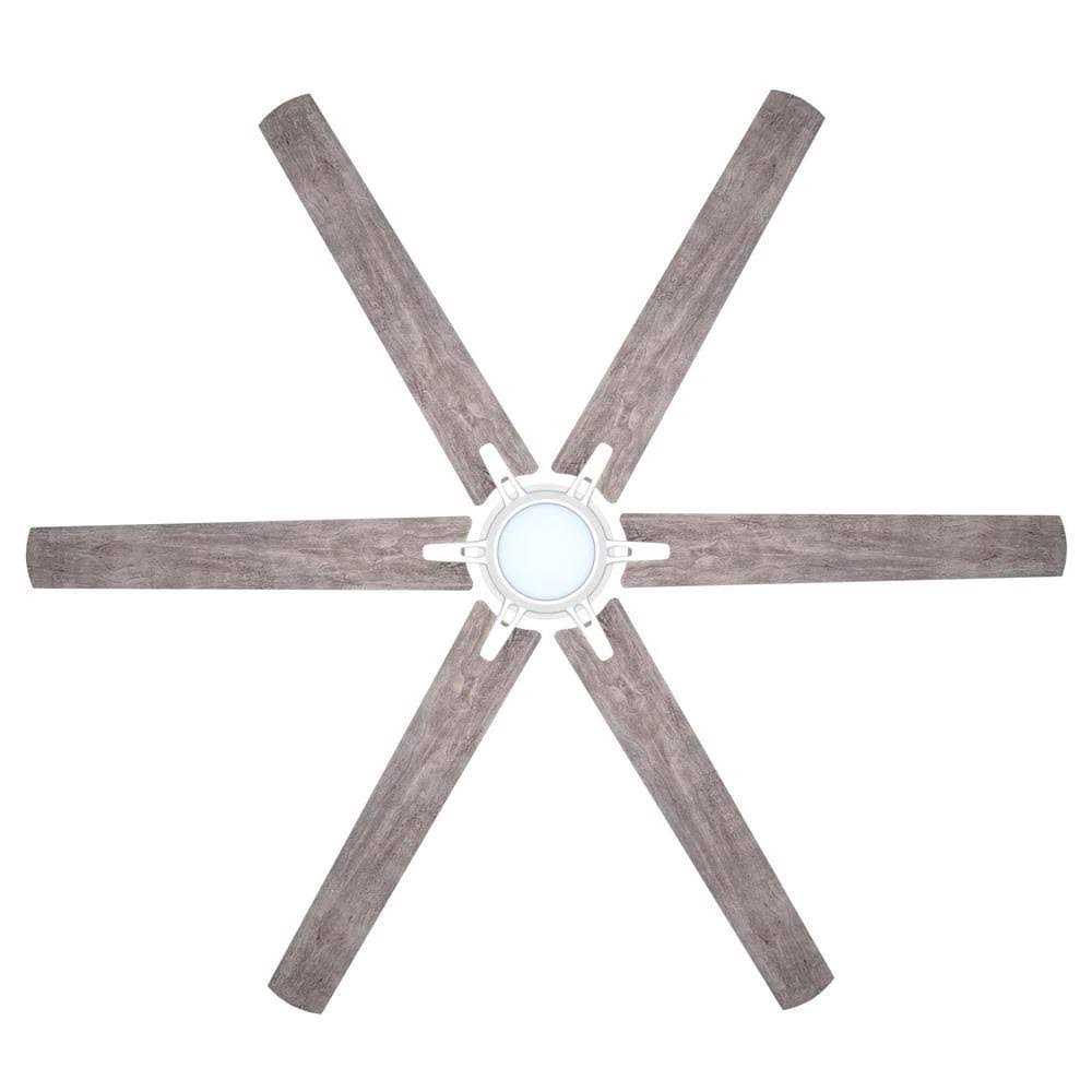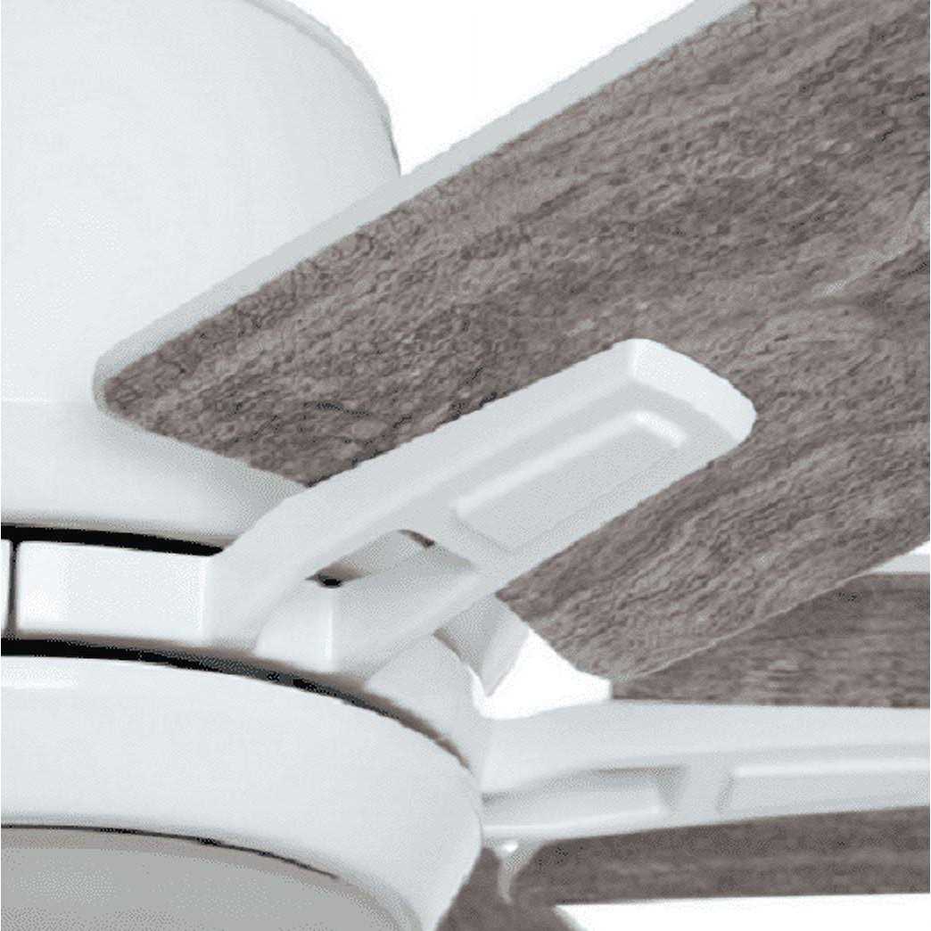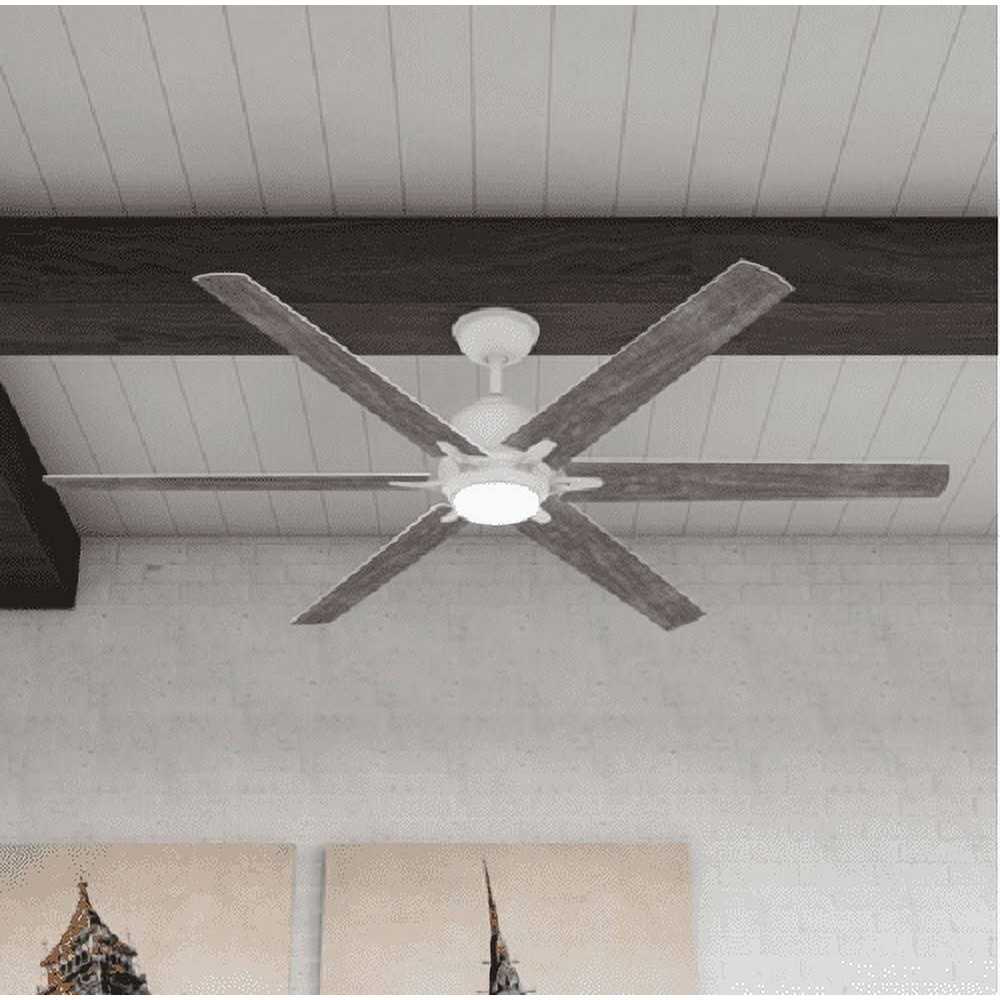 Make a room cooler with this Kensgrove 64-in. ceiling fan. Great for large spaces, it comes with a DC motor and a 9-speed remote control for quiet operation and maximum airflow. Reversible blades in classic white and distressed dark oak create visual interest, and the iron coating completes the charming look. For lighting convenience, this Energy-Star-rated fan includes an 18-watt integrated LED module and a dome-style frosted glass shade.