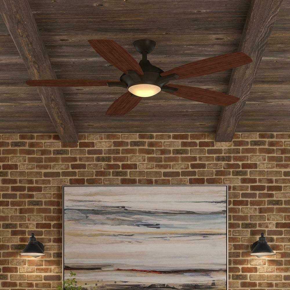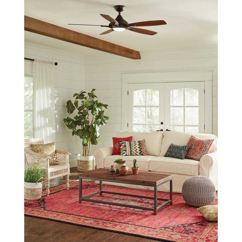 Add an updated look to your transitional decor with the Home Decorators Collection Petersford LED 52 in. This 3-speed fan features 5 reversible blades to help move air efficiently, with quiet, wobble-free operation. The light kit offers a white lens and includes an LED to provide brilliant illumination. The handy remote control provides independent light and speed controls. 5 reversible dark walnut/medium maple blades with 12° blade pitch for greater air movement QuickInstall blades – QuickFit installs 25% Faster compared to traditional fans Handheld remote control offers 3 speeds with independent light and speed control Oil rubbed bronze finish is compatible with many decor styles Designed for indoor use only Ideal for large rooms up to 20 ft. x 20 ft. with blade sweep of 52 in. Uses one 17-Watt LED, included Dual mount installation for standard and sloped ceiling applications up to 20° 4-1/2 in. downrod with 3/4 in.